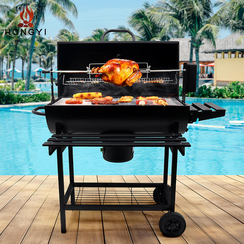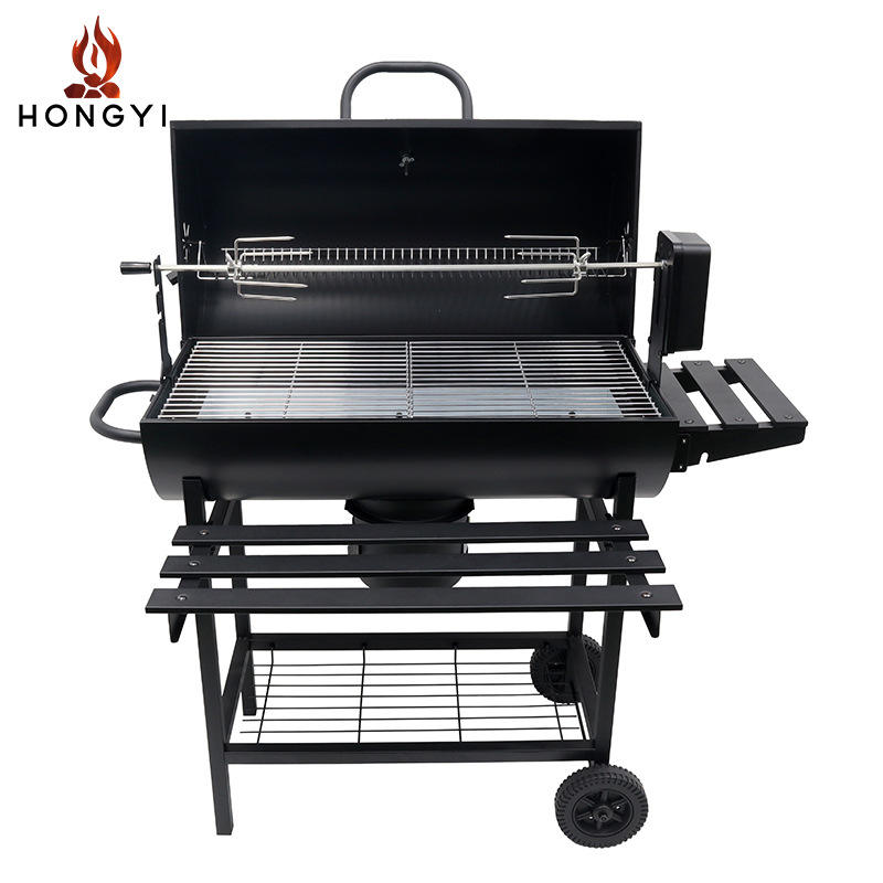 เตาบาร์บีคิวแบบถังน้ำมันขนาดใหญ่สไตล์อเมริกัน HONGYI พร้อมตะแกรงเหล็กสำหรับถ่าน ใช้กลางแจ้ง แบบมีล้อเข็น พร้อมตะเกียบย่างแบบไฟฟ้า