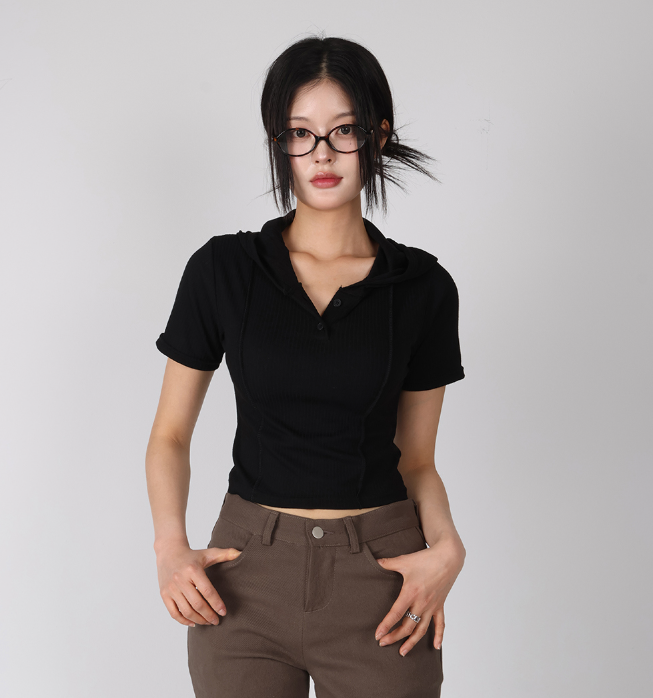 เสื้อฮู้ดครอปแขนสั้นทรงสลิมฟิตผ้าริบสำหรับผู้หญิง รุ่น HOOR H0013 สไตล์เกาหลี ฟรีไซส์ 5 สี