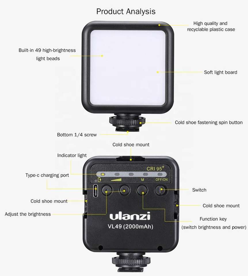 Hoshi ulanzi ไฟวิดีโอ LED VL49 6วัตต์ขนาดเล็กในตัวแบตเตอรี่2000mAh ไฟถ่ายภาพ5500K เทียบกับไฟ LED W49