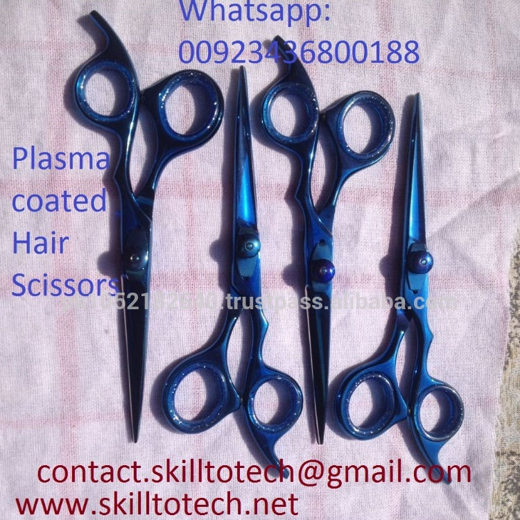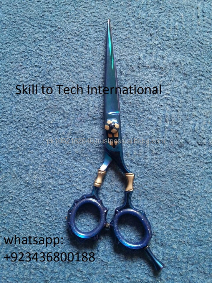 กรรไกรตัดผม J2 ลดราคาพิเศษ ผลิตจากสแตนเลสอย่างดี เคลือบไทเทเนียมพลาสมาสีน้ำเงิน พร้อมสลักโลโก้ด้วยเลเซอร์