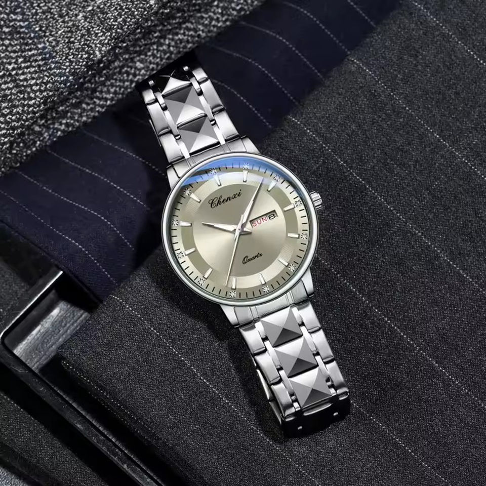Chenxi นาฬิกาควอทซ์601ผู้ชาย, นาฬิกาแฟชั่นปฏิทินสัปดาห์สายสแตนเลสเรืองแสงนาฬิกาธุรกิจกันน้ำ
