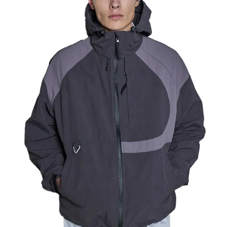 เสื้อแจ็คเก็ตกันลมแบบมีฮู้ด พิมพ์ลายโลโก้ตามสั่ง ผ้าแคนวาส ตัดสี ระบายอากาศ กันน้ำ ไซส์ใหญ่สำหรับผู้ชาย
