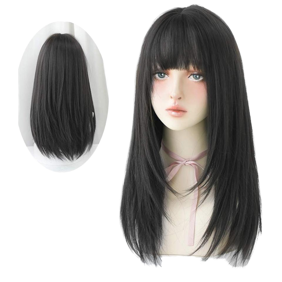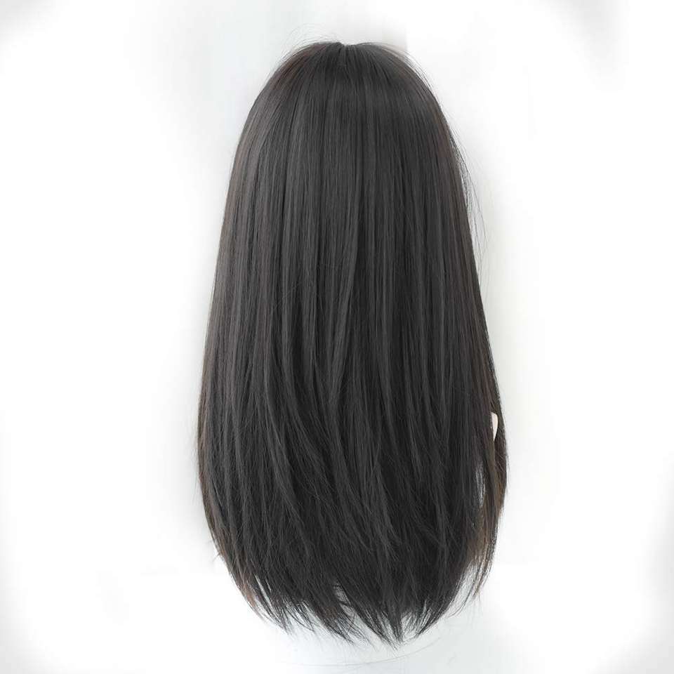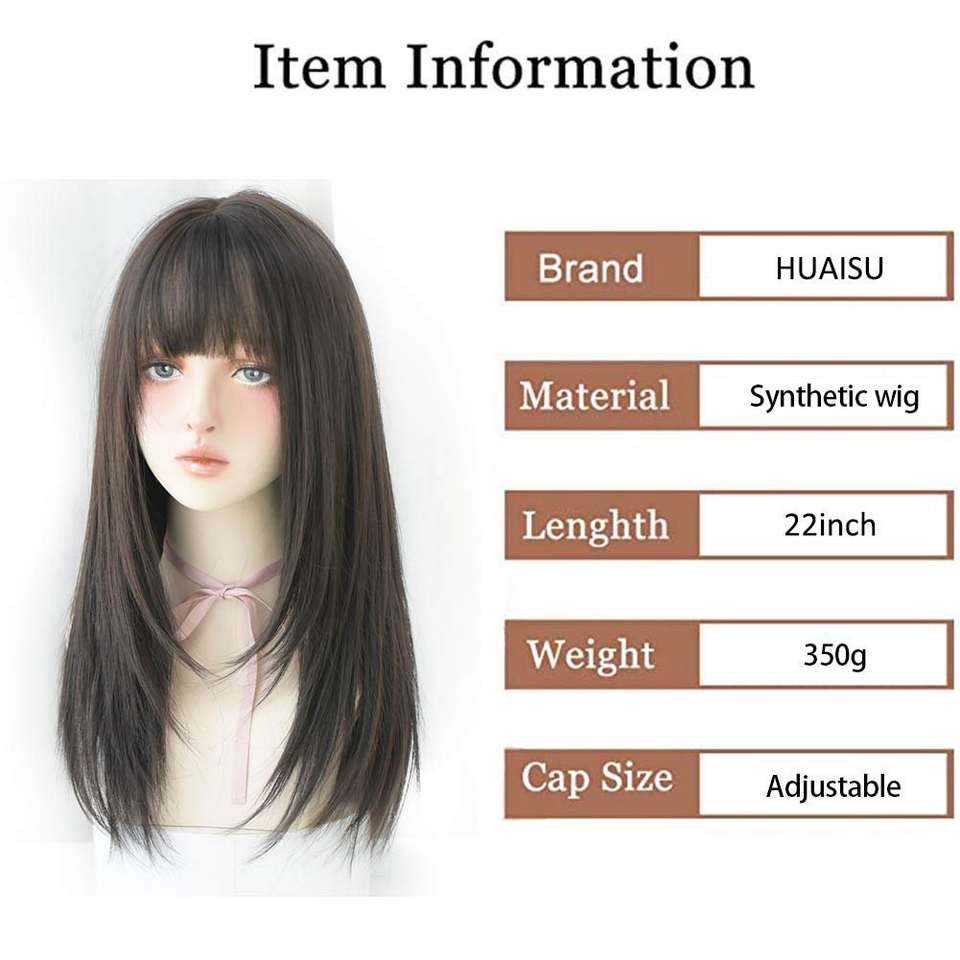 วิกผมสังเคราะห์สีดำตรงยาวสำหรับผู้หญิง HUAISU ผลิตด้วยเครื่องจักร มีหน้าม้า ความหนาแน่นสูง แบบมีเชือกผูกด้านหน้า ขนาดเล็ก ผ้าลูกไม้โปร่งใส