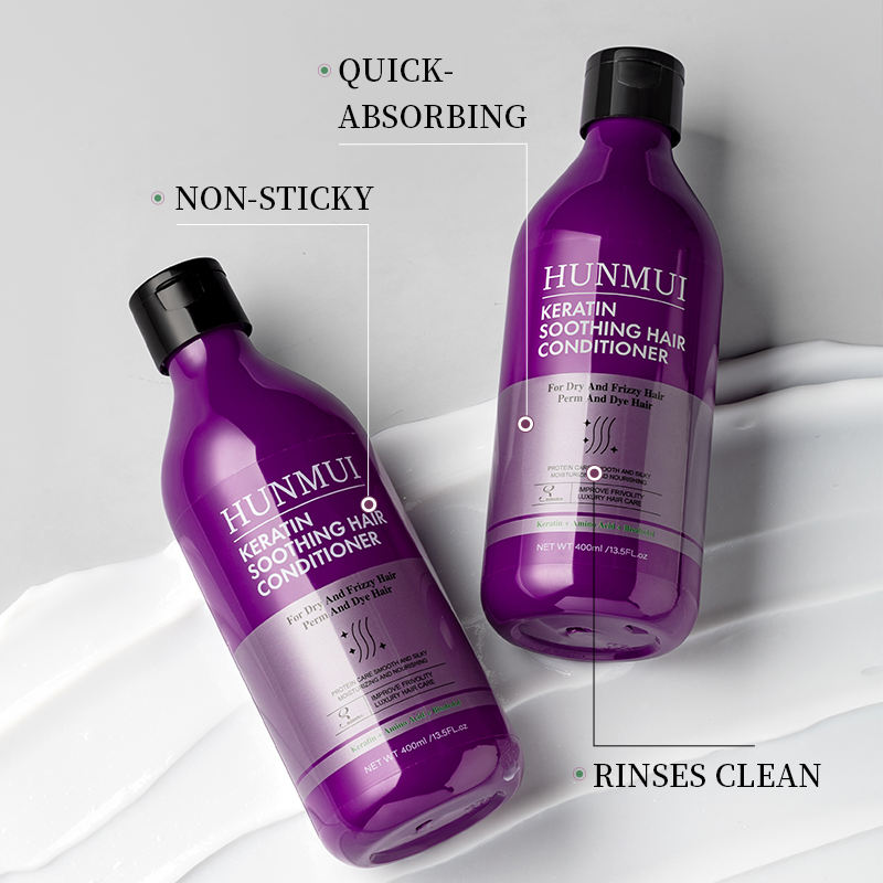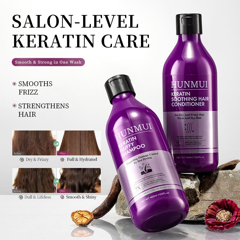 ชุดแชมพูและครีมนวดผมเคราติน HUNMUI สำหรับซ่อมแซมเส้นผมและเพิ่มวอลลุ่ม รับผลิตแบบ OEM ODM ขายส่ง