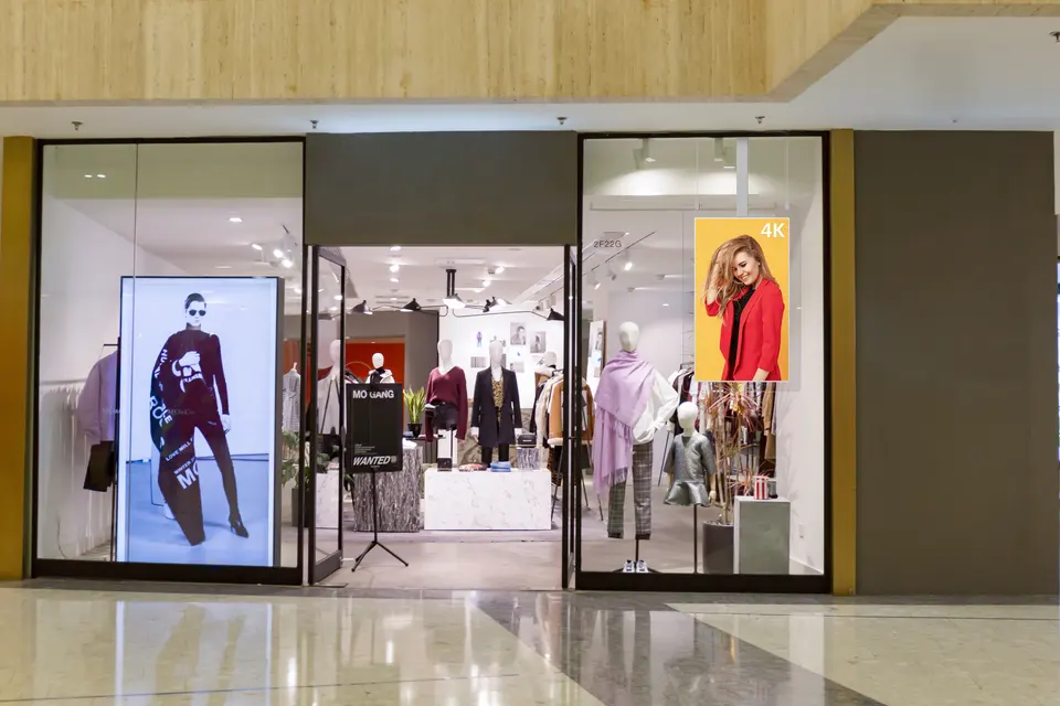 Hushida หน้าจอคู่แขวนเพดานหน้าจอสว่าง700nits หน้าต่างร้านค้าหน้าจอโฆษณา OLED โปร่งใส