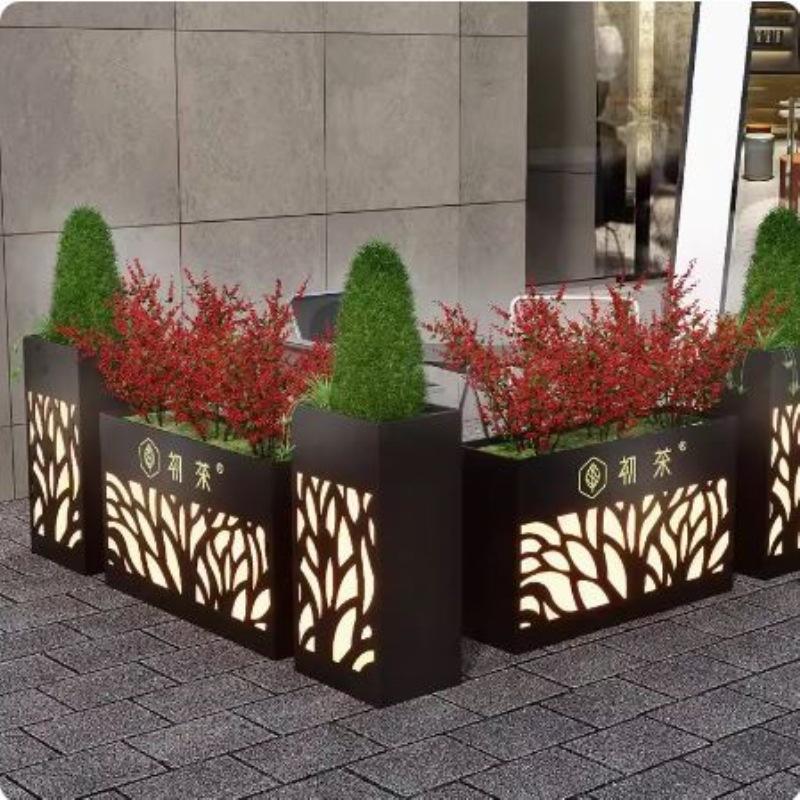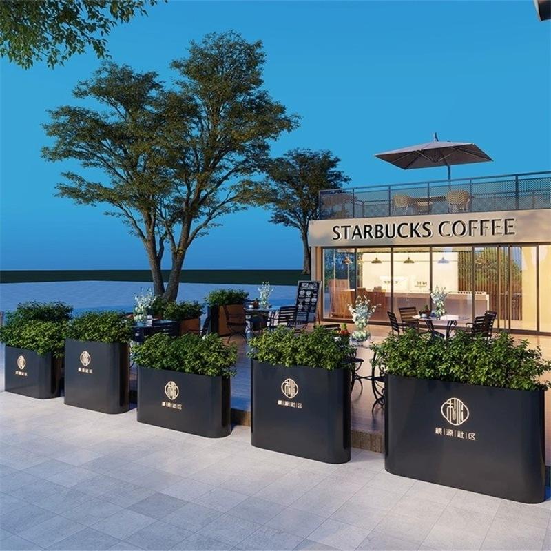 กระถางดอกไม้สแตนเลสสำหรับกลางแจ้ง HX03 ชุดกระถางดอกไม้แบบต่อประกอบได้สำหรับตกแต่งถนนเชิงพาณิชย์ รางปลูกดอกไม้กลางแจ้งพร้อมขาตั้งเหล็ก