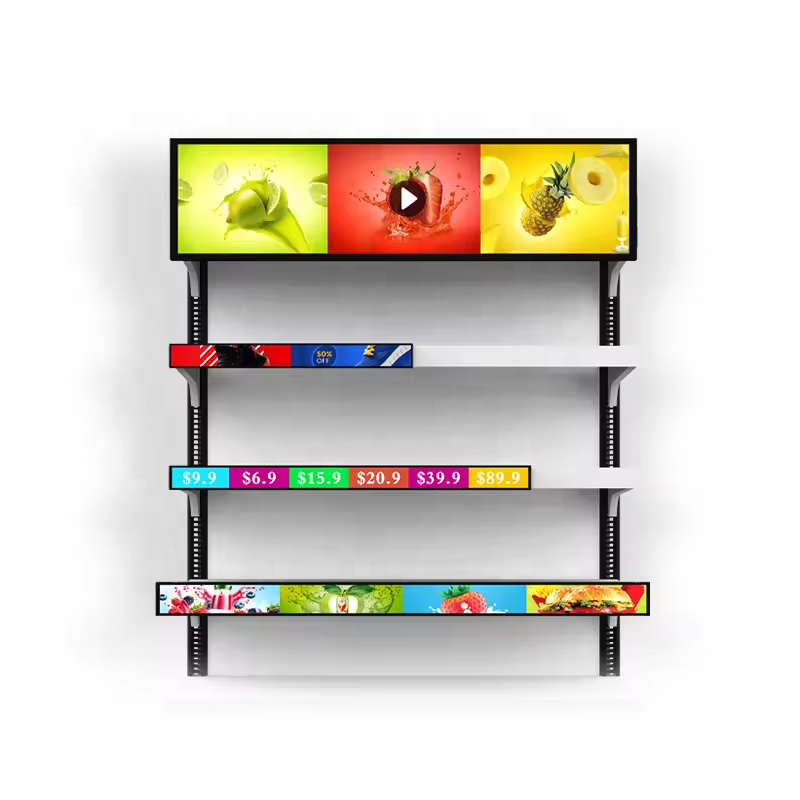 เครื่องเล่นสื่อโฆษณาในร่ม HXXK ขนาดสั่งทำพิเศษสำหรับซูเปอร์มาร์เก็ต จอแสดงผลแบบแถบยาวพิเศษสำหรับชั้นวางสินค้า จอ LCD แบบยืดได้ รองรับ 4G รับประกัน 1 ปี