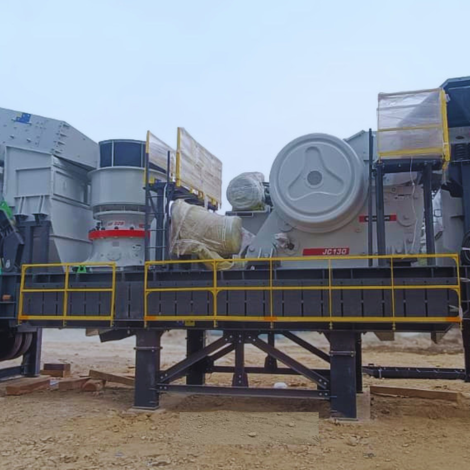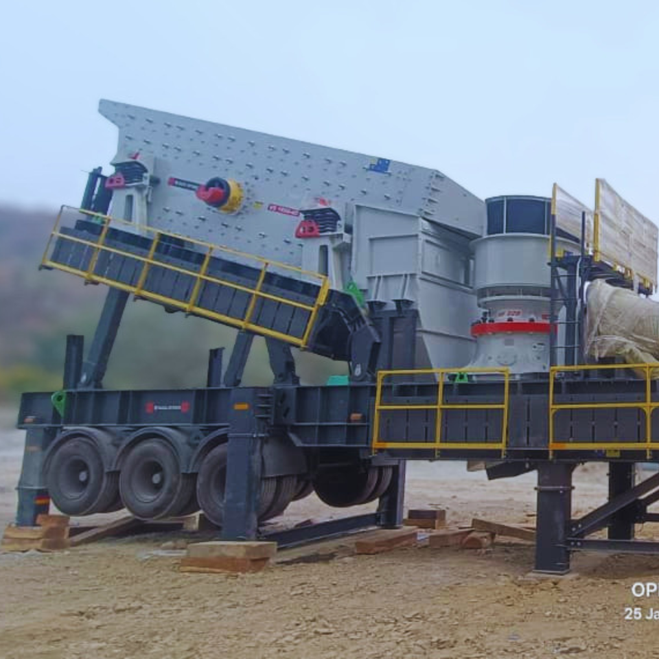 โรงงานบดแบบเคลื่อนที่บนล้อ Hailstone 2 ขั้นตอน พร้อมระบบบดแบบกรามและแบบกรวยในตัว สำหรับการบดขั้นต้นและขั้นท้าย (อินเดีย)