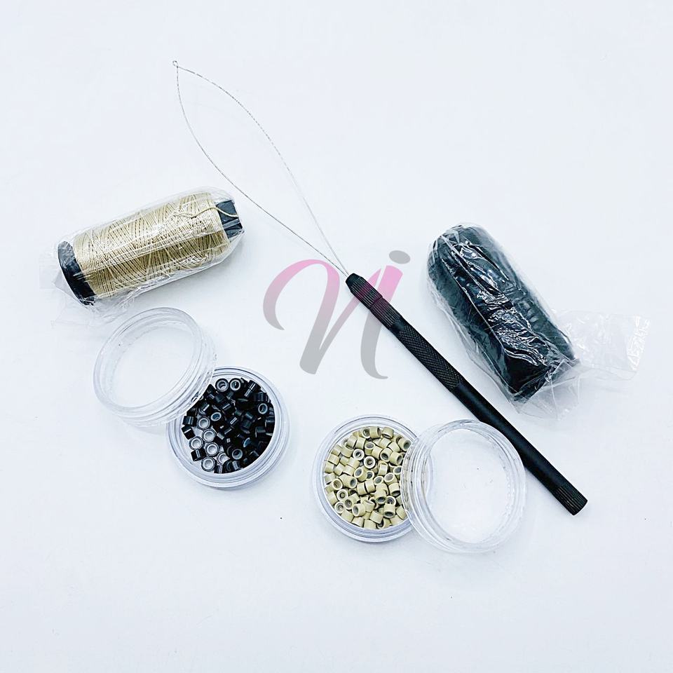 ชุดอุปกรณ์เสริมสำหรับต่อผมประกอบด้วยกล่องลูกปัด2เส้นและด้าย2เส้นสีดำและสีเบจสำหรับต่อผม