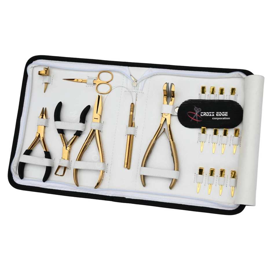 ชุดติดตั้งผมต่อ ปลายแบนสีทอง & คีมย้ำผมสามรู