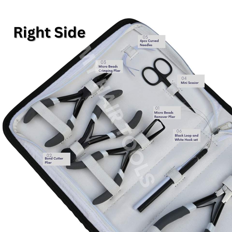 ชุดอุปกรณ์ต่อผม ประกอบด้วยคีมหนีบและถอดเม็ดบีด คีมกดเทปต่อผม ตะขอเกี่ยวผม คลิปแบ่งผม บรรจุในกระเป๋าเร็กซีน