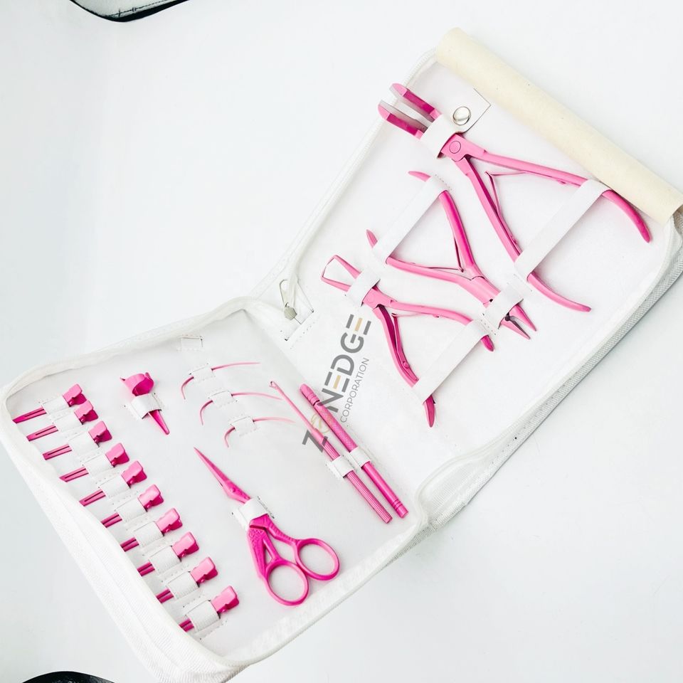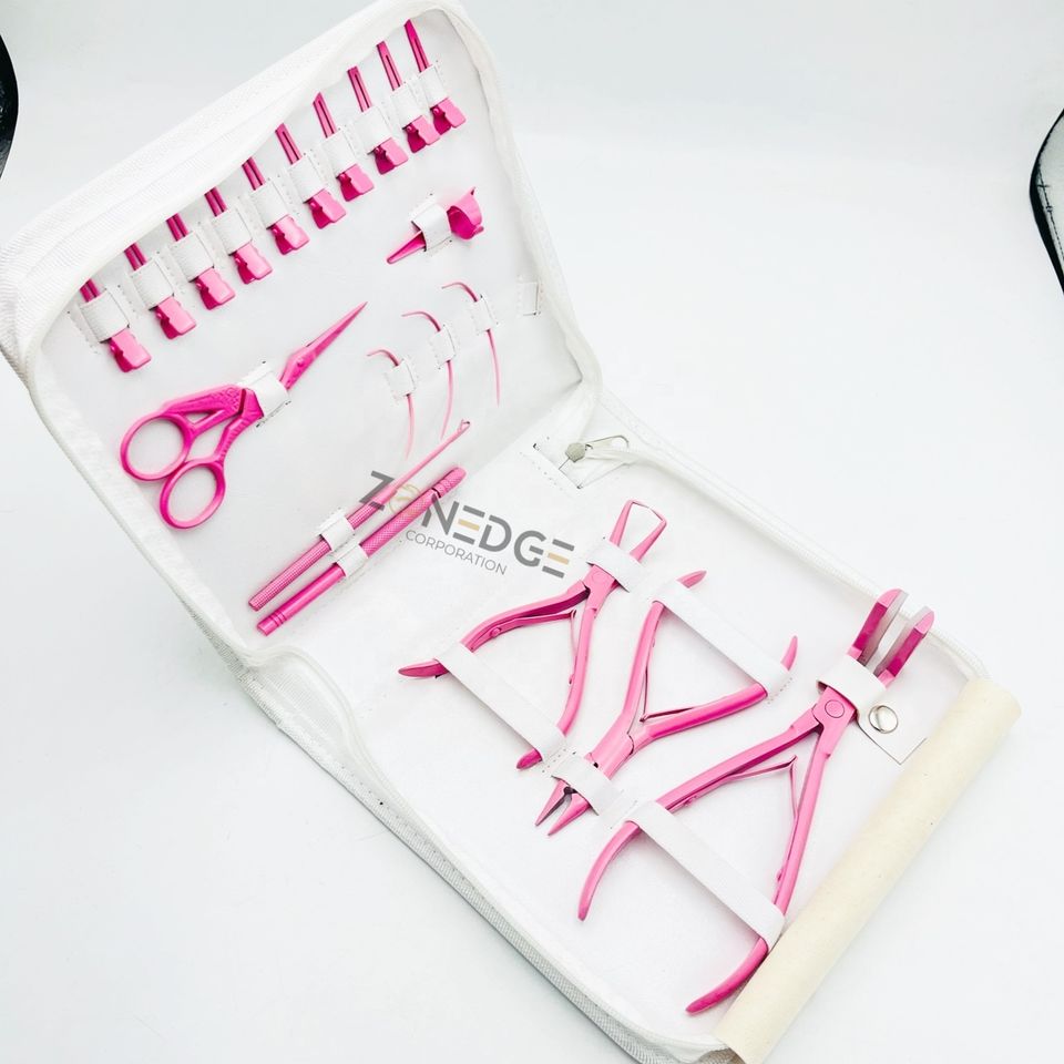 ชุดเครื่องมือต่อผมเทปในคีมต่อผมที่บดลูกปัดถอดคีมสแตนเลสที่มีเคสสีขาวสีชมพู