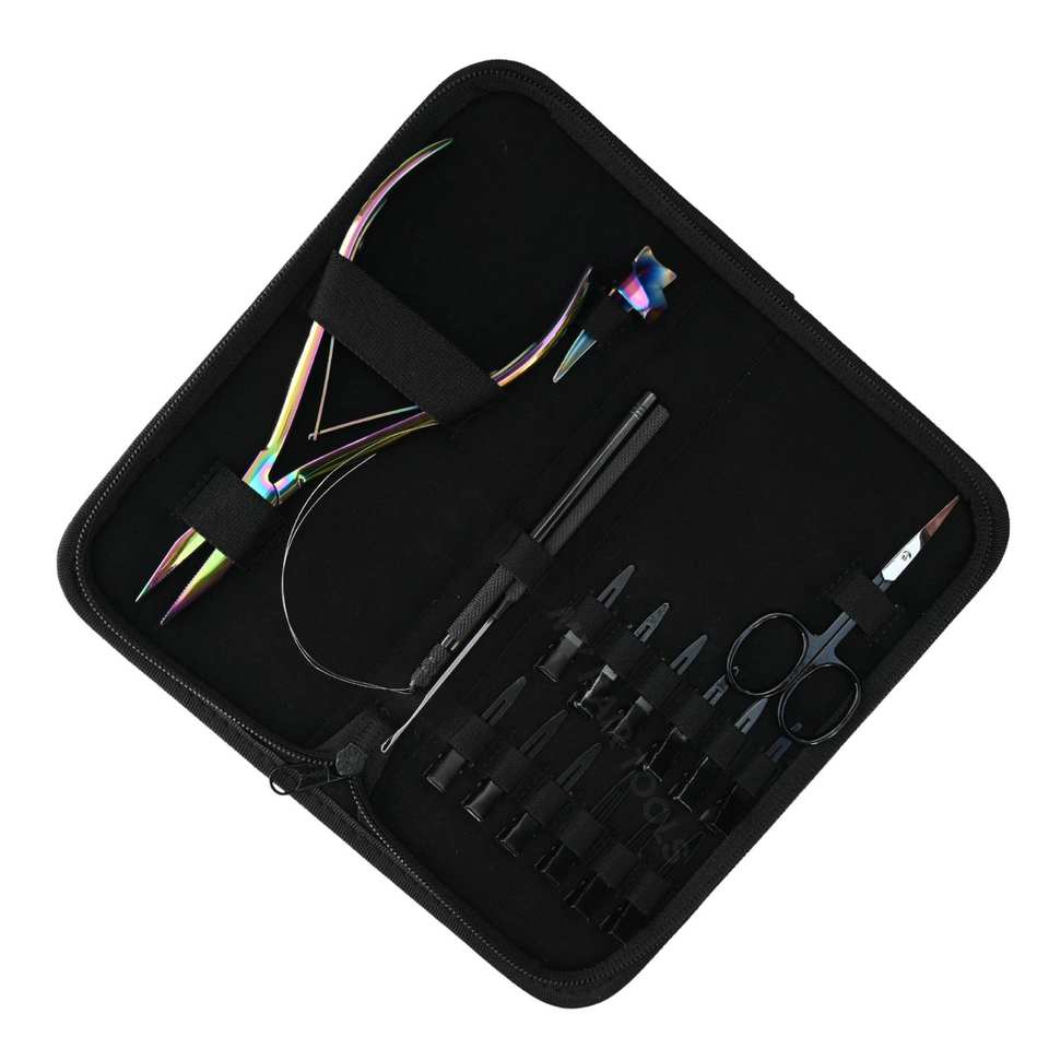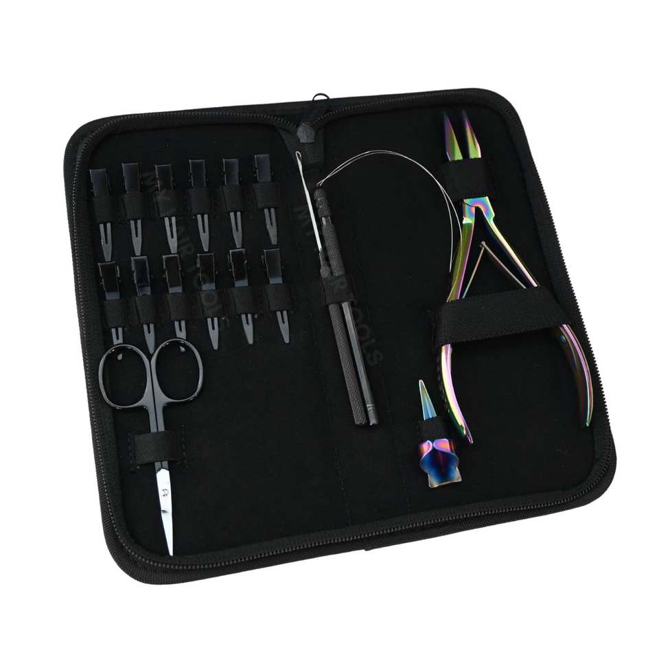 ชุดอุปกรณ์ต่อผม พร้อมสายดึง, ห่วงเกี่ยว, เครื่องร้อยไหม, ที่หนีบผมแบบเรียบสีรุ้ง, แหวนแบ่งผม, กรรไกรตัดขนาดเล็ก และคลิป