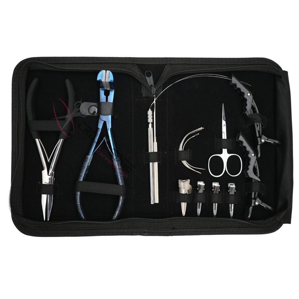 ชุดอุปกรณ์ต่อผมพร้อมที่หนีบผมแบบเทป ที่หนีบผมแบบลูกปัดแบน ที่ร้อยลวดแบบมีห่วง พร้อมตะขอ กรรไกรตัดผมขนาดเล็ก และกิ๊บจัดแต่งทรงผม