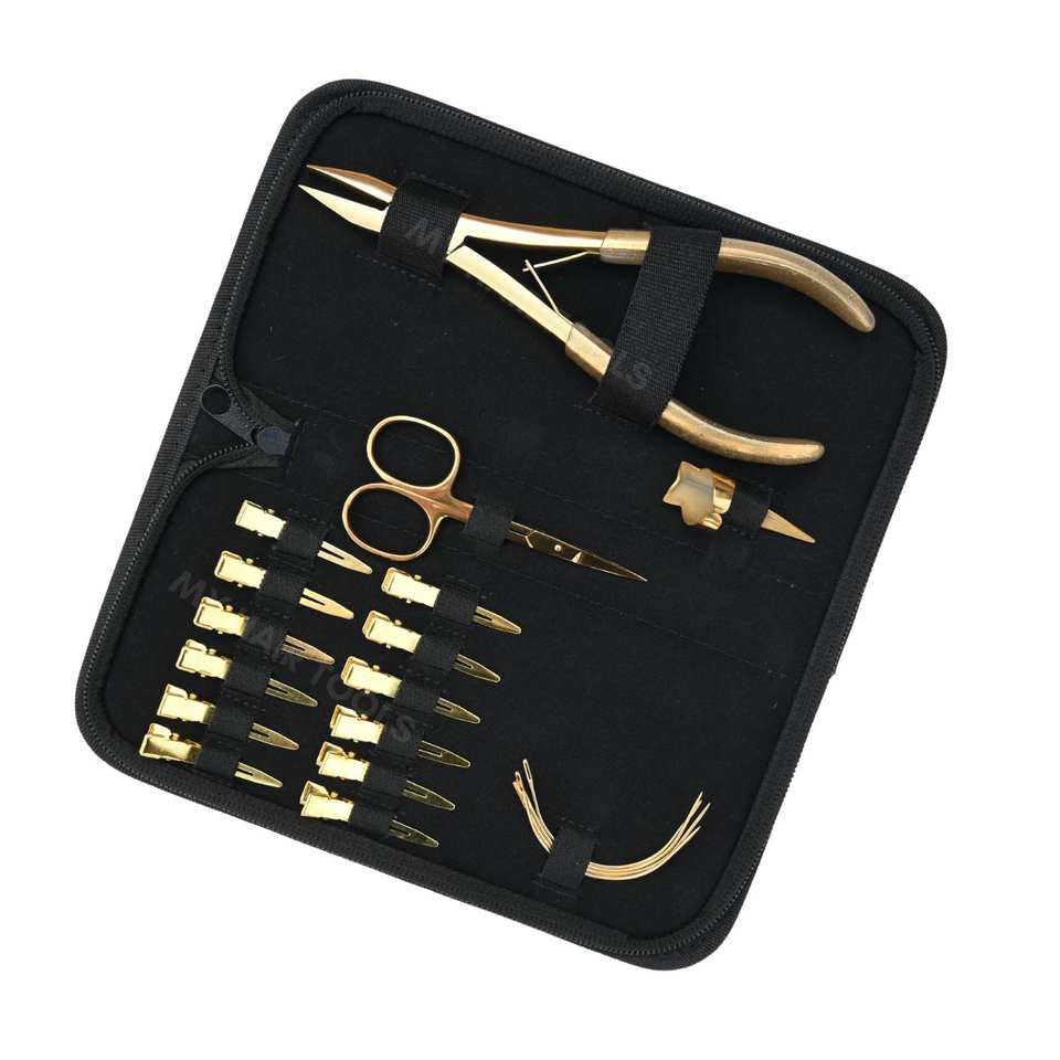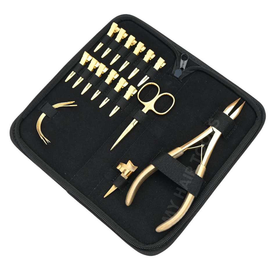 ชุดเครื่องมือต่อผมสีทอง พร้อมคีมหนีบผมแบบหัวแบนสำหรับงานหนัก