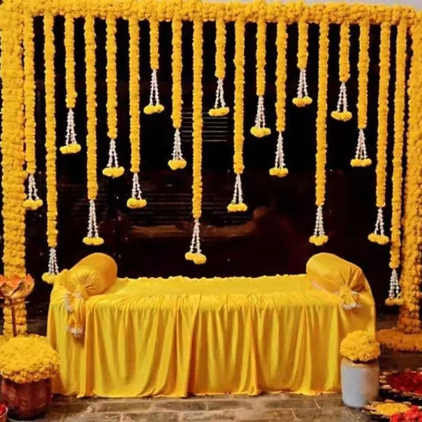 ชุดตกแต่ง haldi มาลัยดอกดาวเรืองพร้อมดอกลิลลี่สำหรับตกแต่งเสาตกแต่ง Pooja และพิธีแต่งงาน haldi medecor