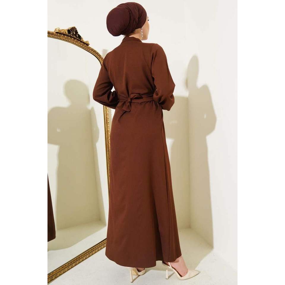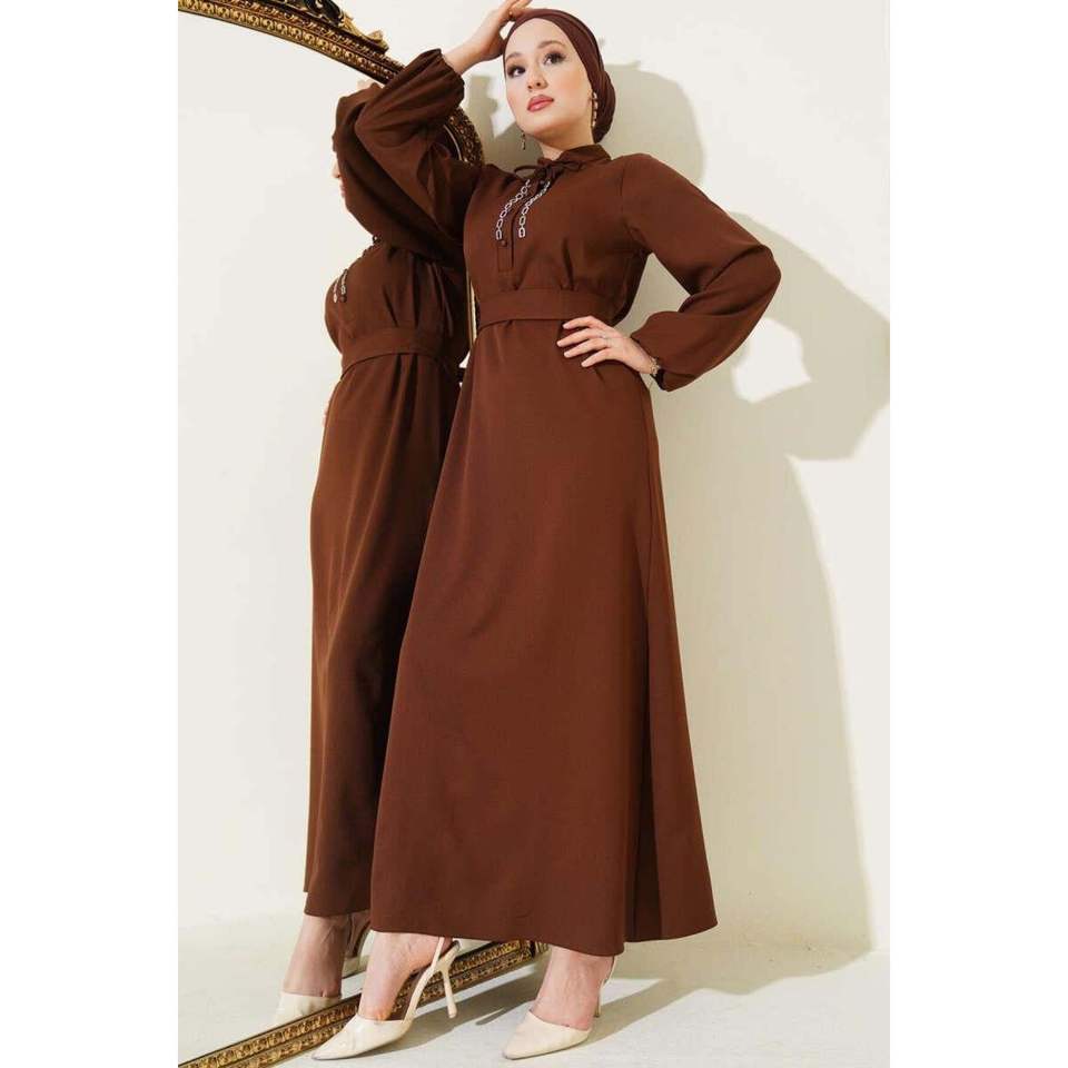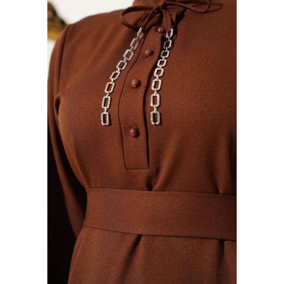 ชุดเดรสสายคล้องคอแต่งกระดุมครึ่งเม็ดสีน้ำตาล