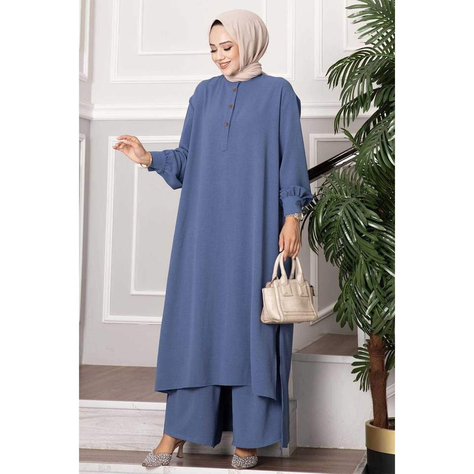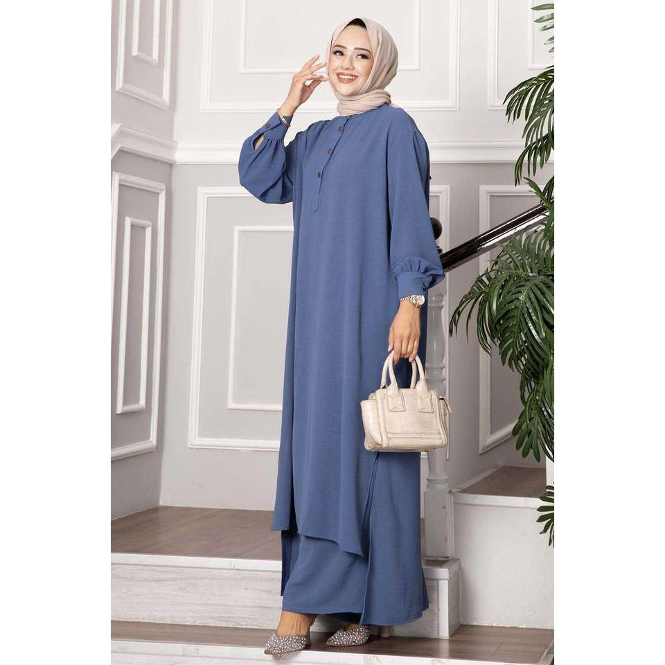 Half Buttoned Long Hijab 2 Piece Suit Indigo