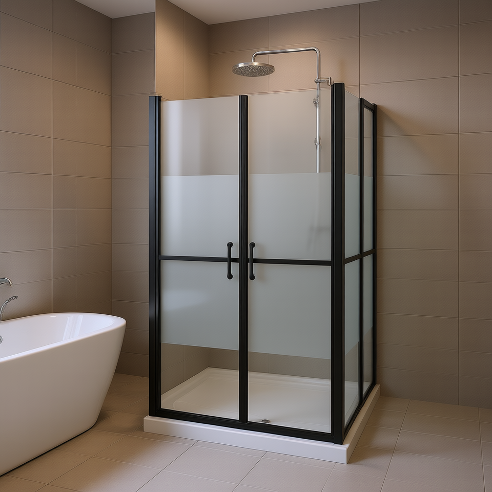 ประตูห้องอาบน้ำแบบครึ่งบานฝ้า 30.7-31.9x74.8 นิ้ว กรอบสีดำ กระจกนิรภัย บานพับ รูปทรงสี่เหลี่ยมผืนผ้า ดีไซน์มินิมอล