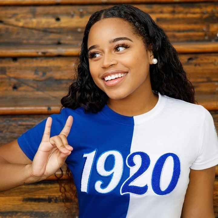 เสื้อยืดกำมะหยี่1920สีขาวสีน้ำเงินครึ่งสีฟ้าเสื้อเชิ้ตแฟชั่นสตรีปักลายตัวอักษรวิทยาลัยผ้าฝ้าย