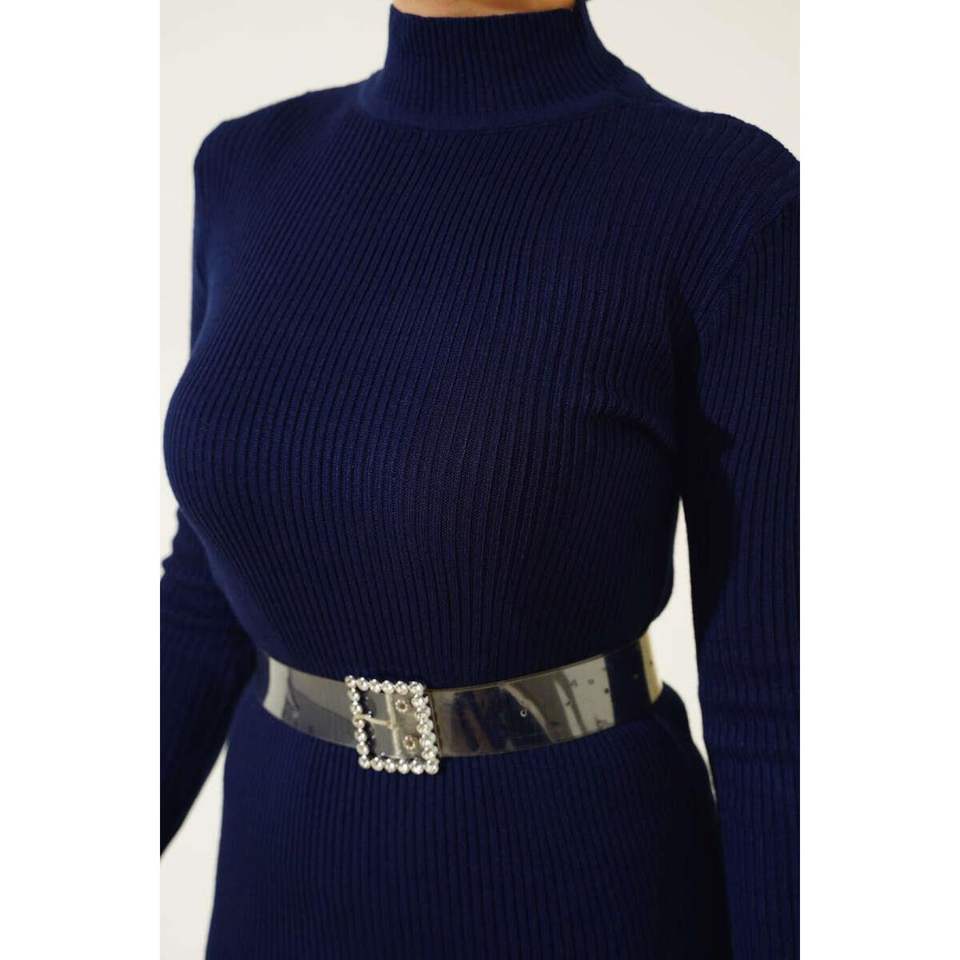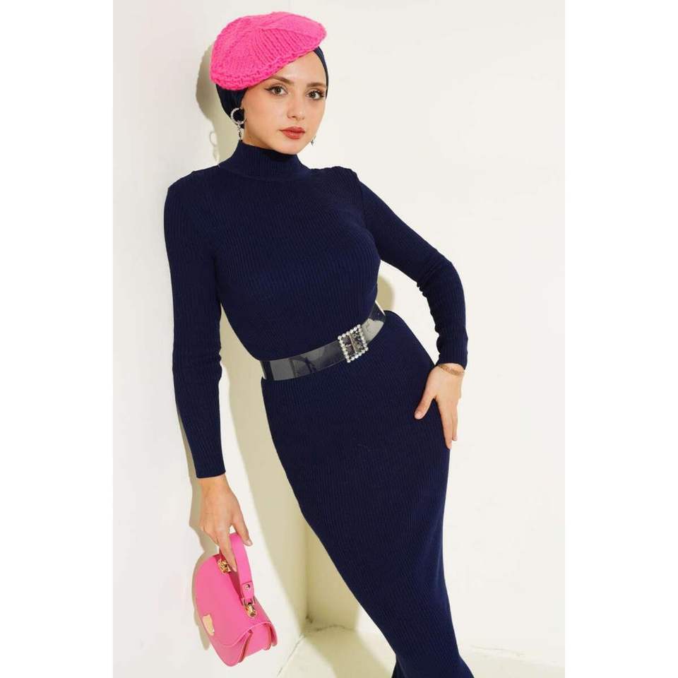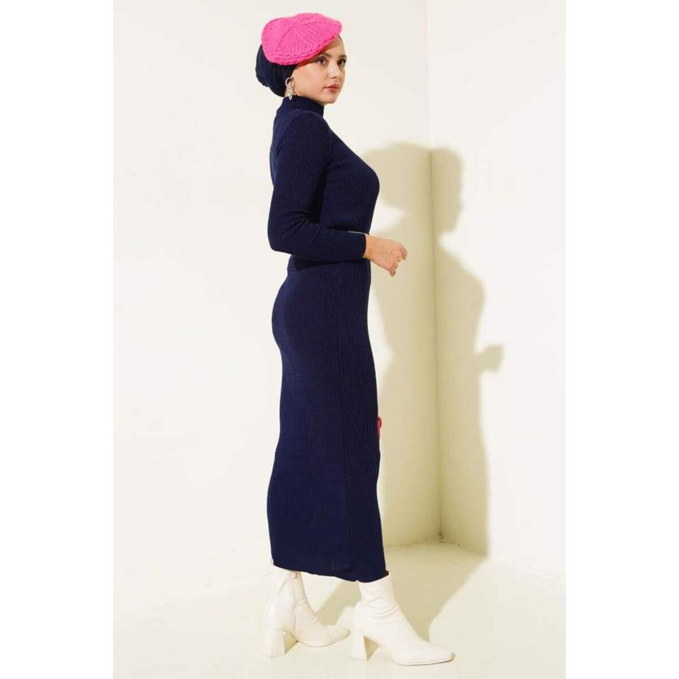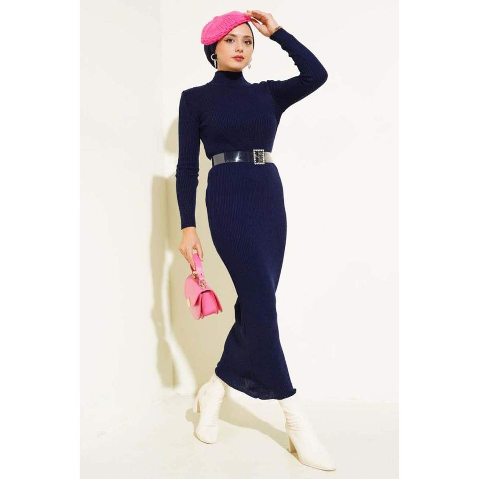 เดรสถักครึ่งคอแบบบางสีน้ำเงินเข้ม