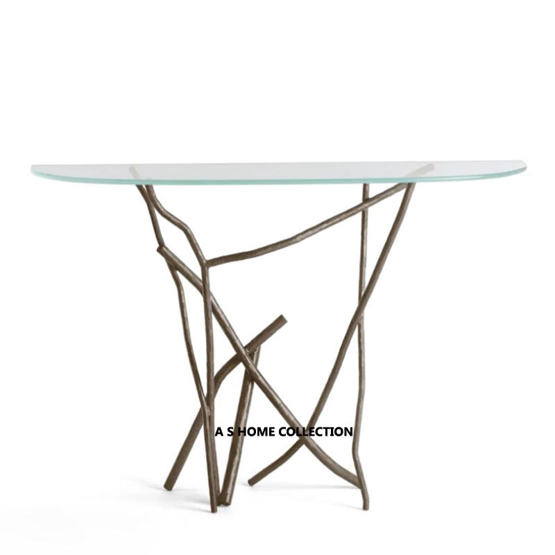 โลหะครึ่งกลมตกแต่งหรูหราสีทองบ้านห้องนั่งเล่นโต๊ะคอนโซลกระจกด้านบน