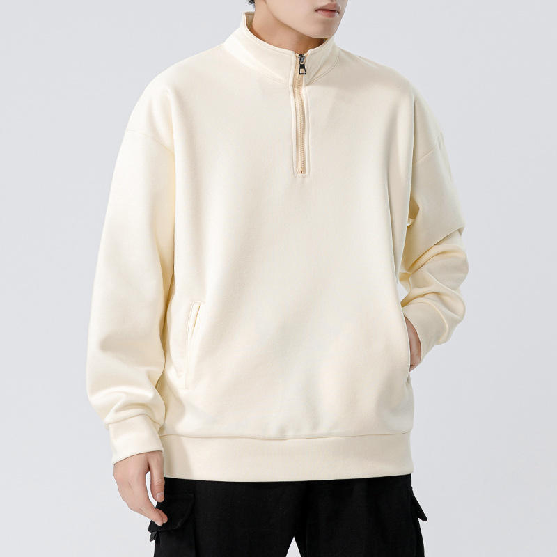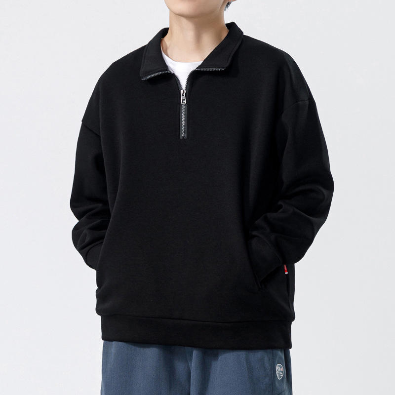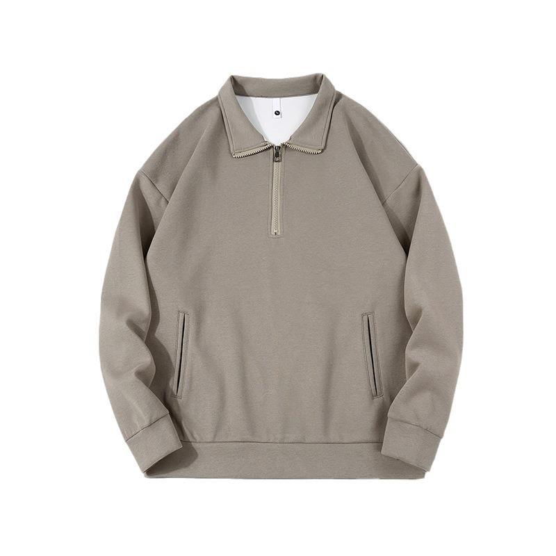 เสื้อโปโลแขนยาวมีซิปครึ่งแขนเสื้อสเวตเชิ้ตลำลองสีพื้นหนาสไตล์ฤดูหนาว