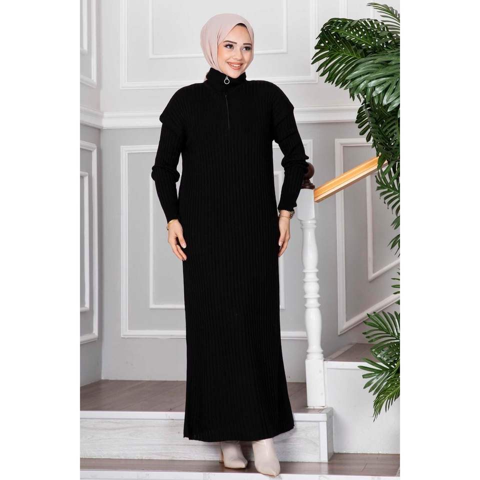 เดรสเสื้อยืดฮิญาบแบบซิปครึ่งตัว สีดำ ลายเรียบ ทรงมาตรฐาน