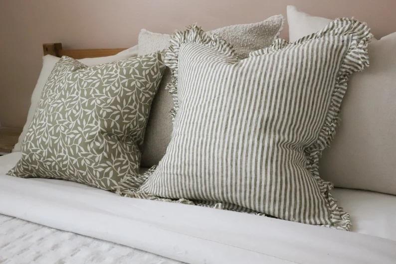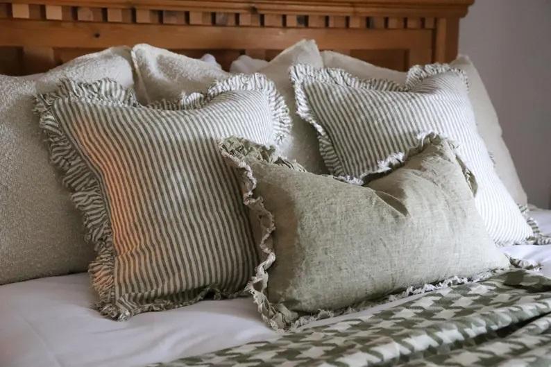 หมอนอิงผ้าลินินลายทางฮอลลี่ โอลีฟ แต่งระบาย พร้อมไส้ขนเป็ด ทำมือ สไตล์นูทรัล ดีไซน์เนอร์ ลายทางระบาย
