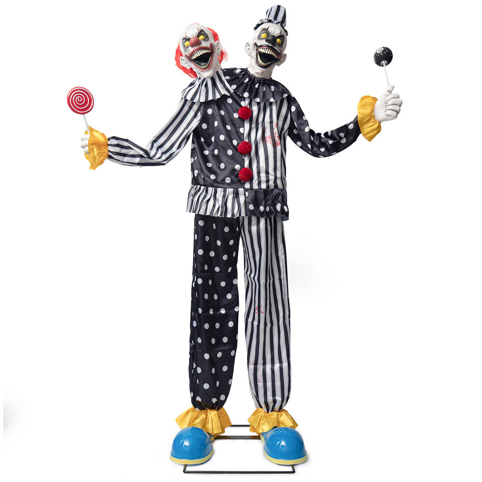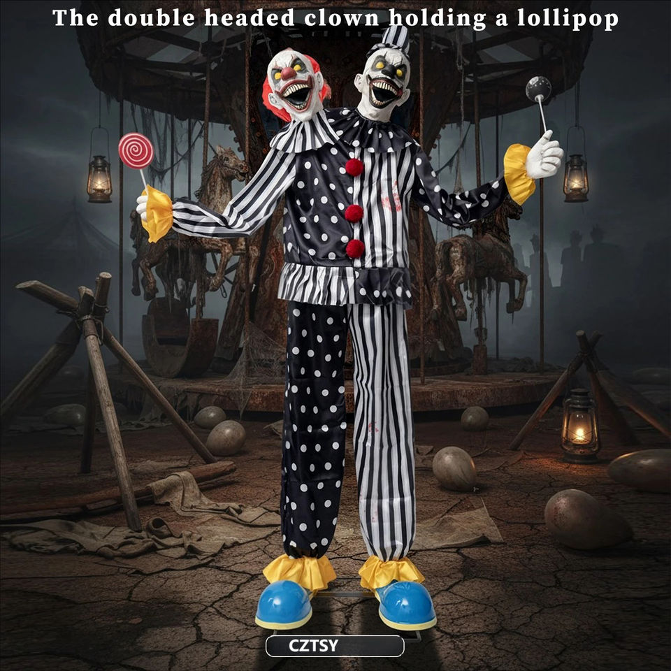 Halloween Cross-border Hot Sale Large Mechanical Electric Induction Luminous Double-headed Clown Latex Fabric Striped Polka Dot