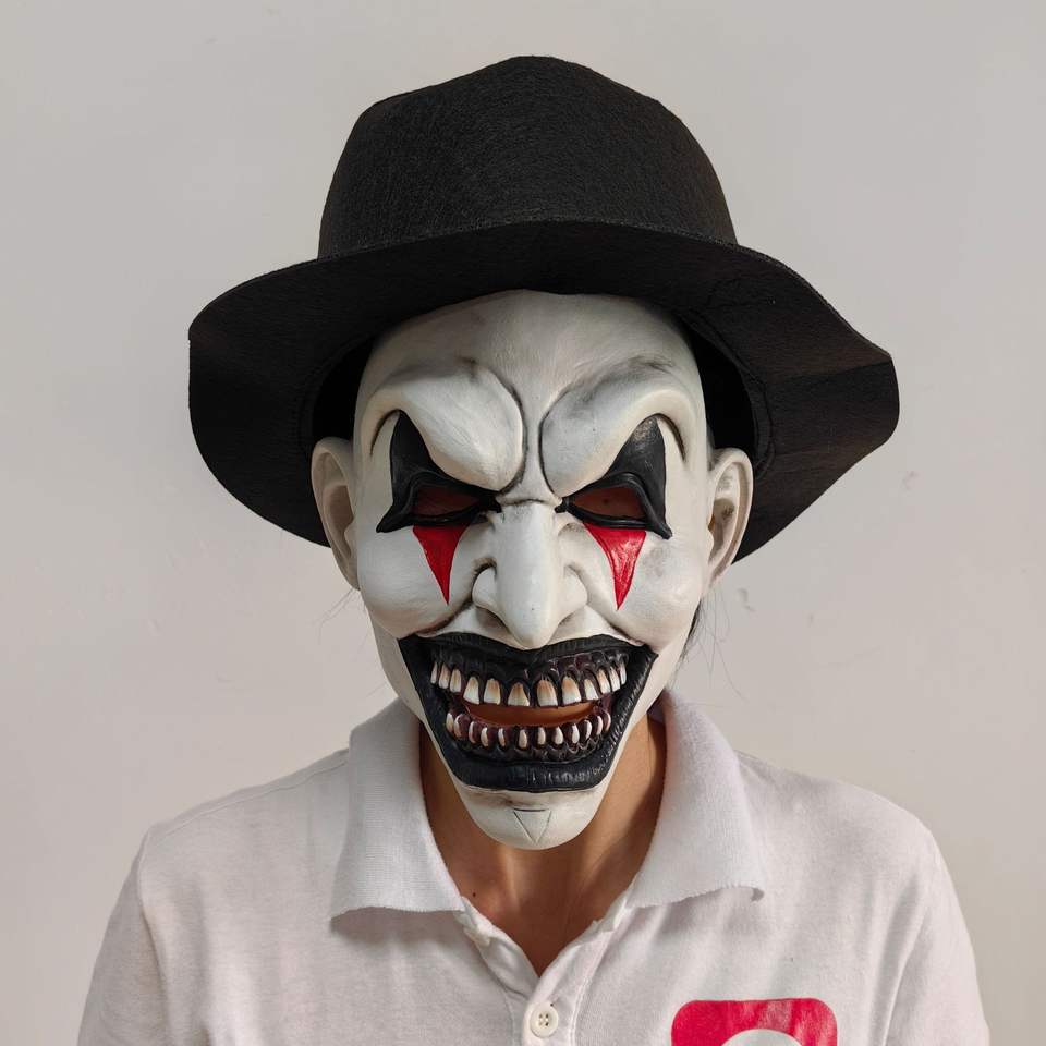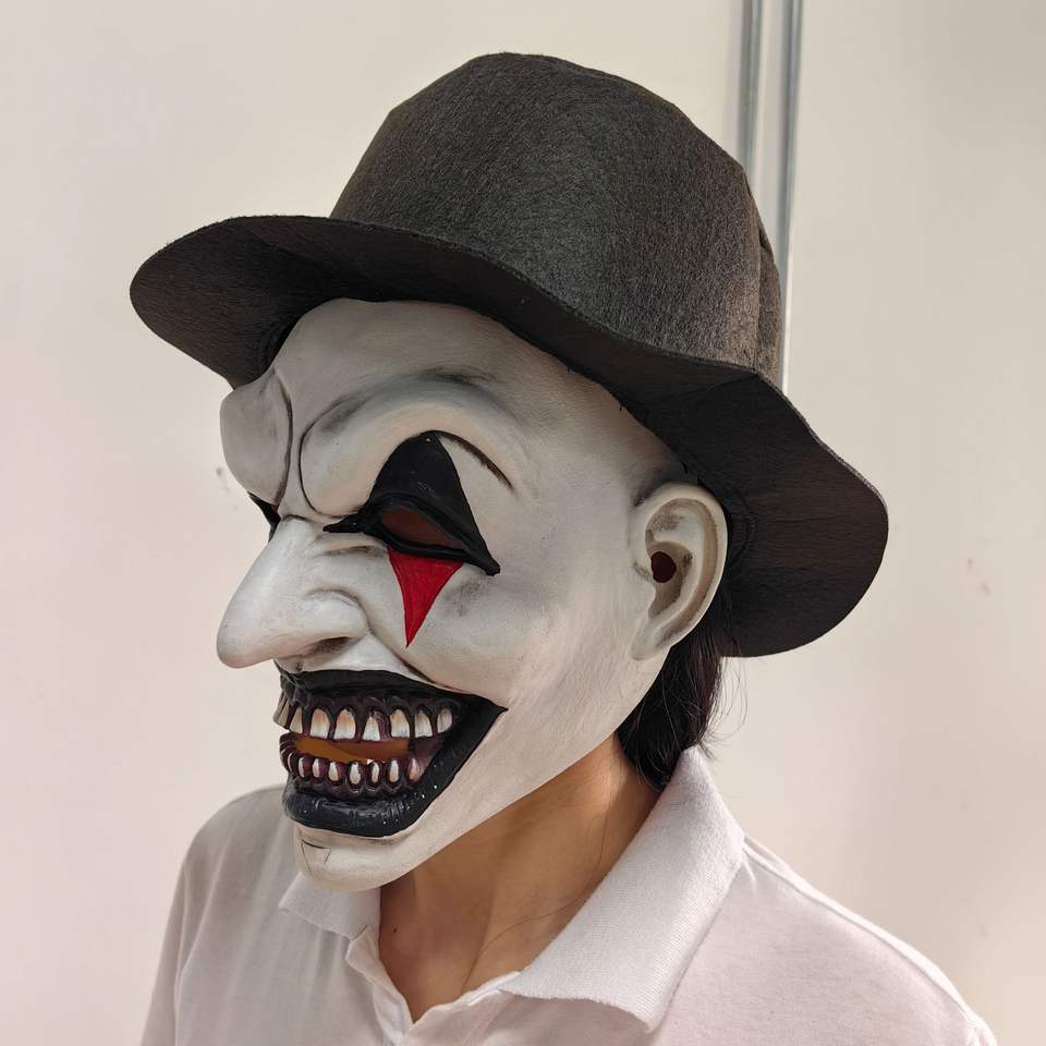 หน้ากากตัวตลกฮาโลวีนทำจากยางลาเท็กซ์พร้อมหมวก อุปกรณ์ประกอบฉากสยองขวัญสำหรับตกแต่งงานปาร์ตี้แฟนซี