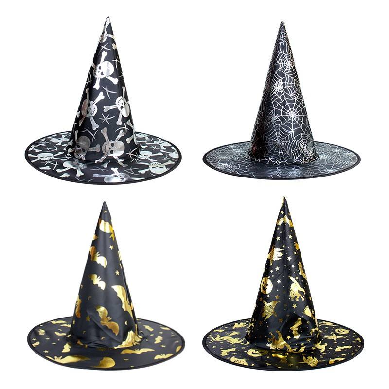 หมวกฮาโลวีนสำหรับเด็กผู้ใหญ่หมวกพ่อมดมหัศจรรย์อุปกรณ์เสริมสำหรับงานปาร์ตี้หมวกแม่มดหัวแหลมพิมพ์ลายใยแมงมุม