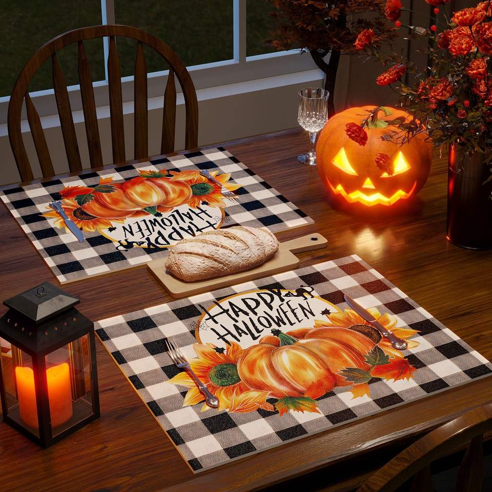 แผ่นรองจานลายสก็อตสำหรับวันฮาโลวีน รูปทรงสี่เหลี่ยม ทำจาก PVC กันน้ำและกันความร้อน สำหรับห้องรับประทานอาหาร