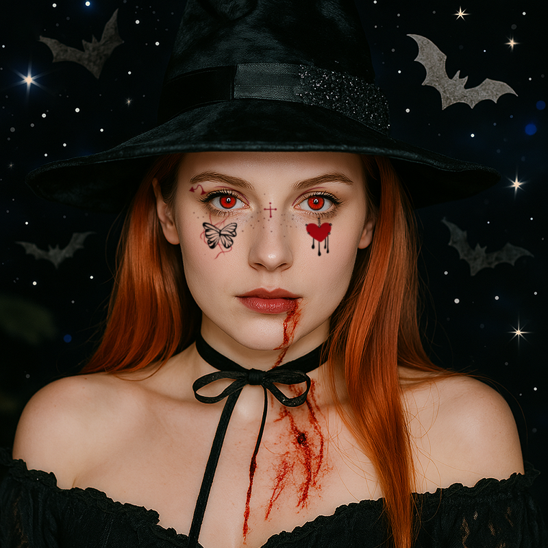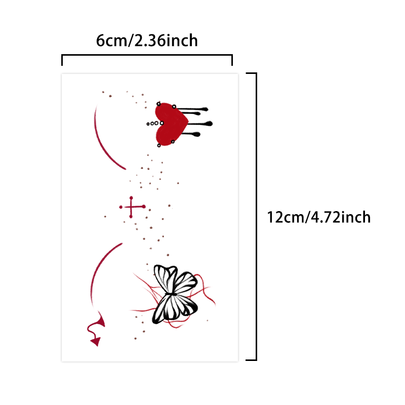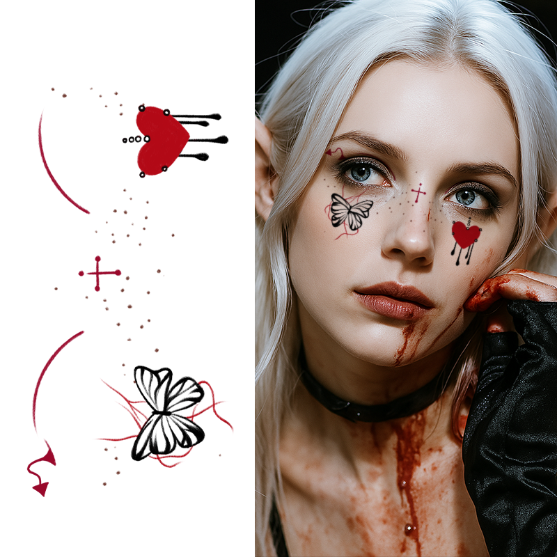 สติกเกอร์รอยสักฮาโลวีนฮาโลวีนฮาโลวีนฮาโลวีนหัวใจเลือดผีเสื้อสีดำน่าขนลุกแต่งหน้ารอยสักกันน้ำสำหรับหน้าแขน