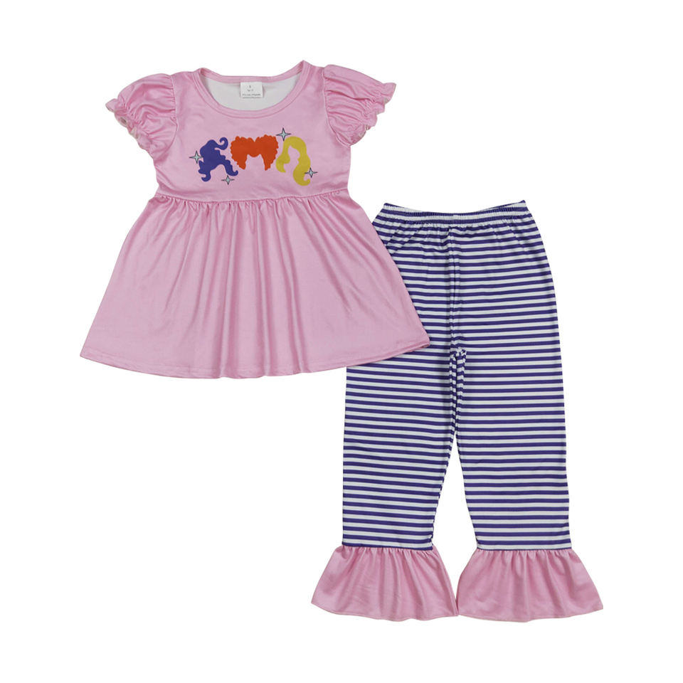 ชุดเสื้อผ้าเด็กผู้หญิงสำหรับเด็กวัยหัดเดินลายสีม่วงแขนกระพือสีชมพูแม่มดสามตัวสำหรับวันฮาโลวีน