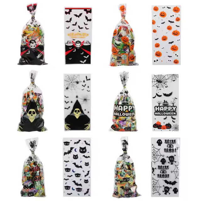 ถุงกระดาษแก้วใสสำหรับฮาโลวีนเคล็ดลับหรือทรีทพลาสติกห่อของขวัญสำหรับคุกกี้สารพัดขนมและเยลลี่