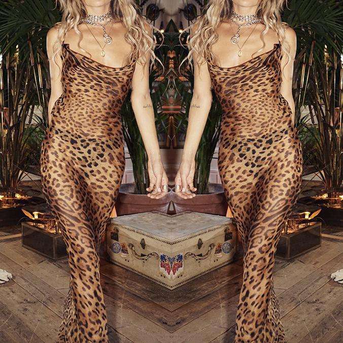 ชุดเดรสผู้หญิงเซ็กซี่พิมพ์ลายเสือดาวโชว์หลัง
