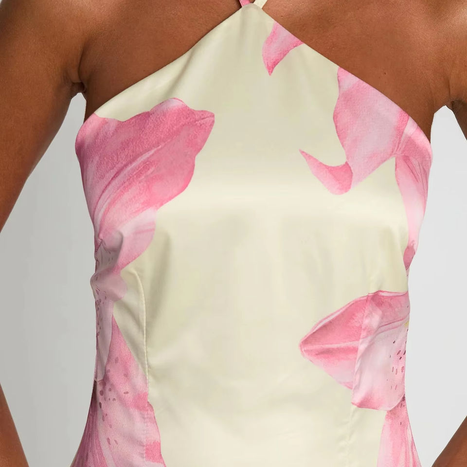 เดรสปาร์ตี้แบบเปิดหลัง ผ้าซาตินพิมพ์ลายดอกลิลลี่สีชมพู คอแบบผูก สายคล้องคอ สไตล์ลำลอง สวยสง่า
