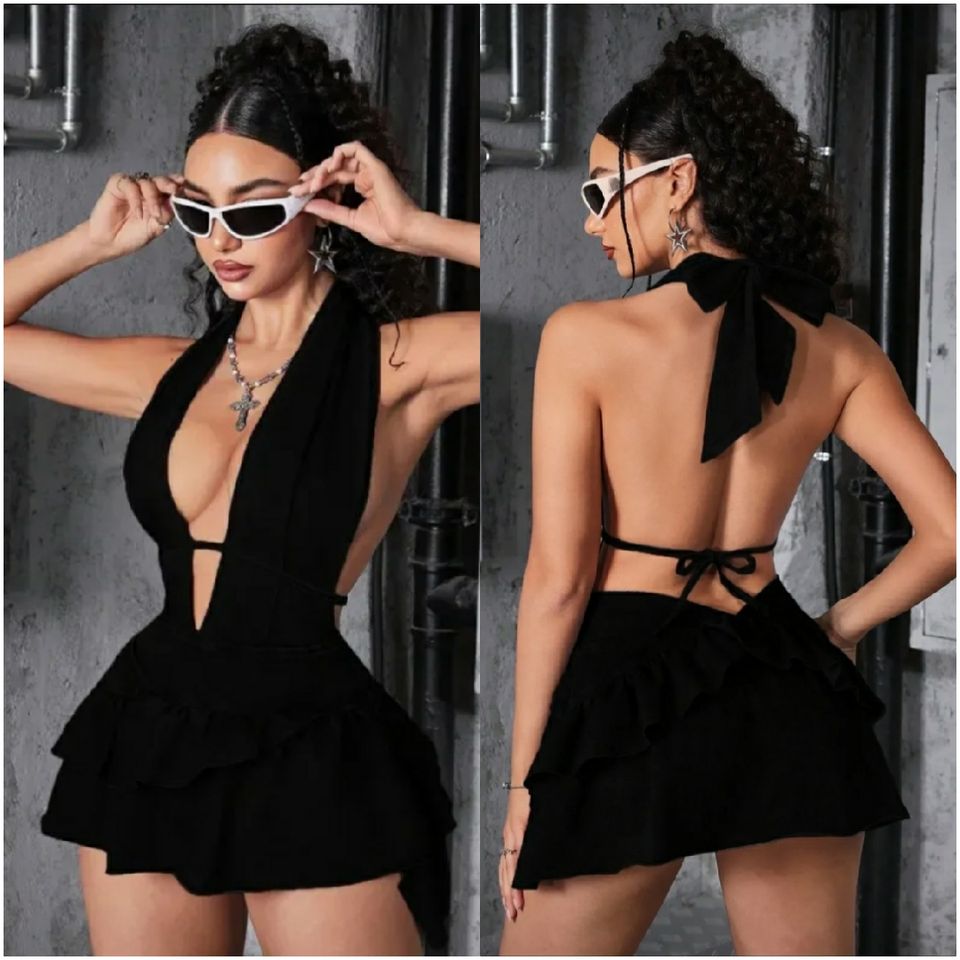 เดรสสั้นคอ halter แบบเว้าลึก แต่งระบาย ด้านหลังเปลือย กระโปรงทรงสเกิร์ตแบบมีชั้น แต่งระบาย คอวีลึก สไตล์ Urban Noir เดรส halter แบบเว้าช่วงตัว