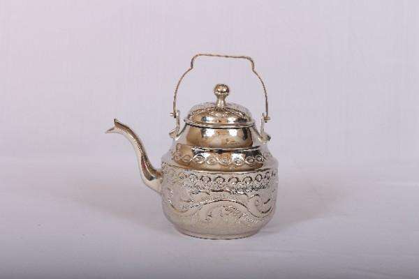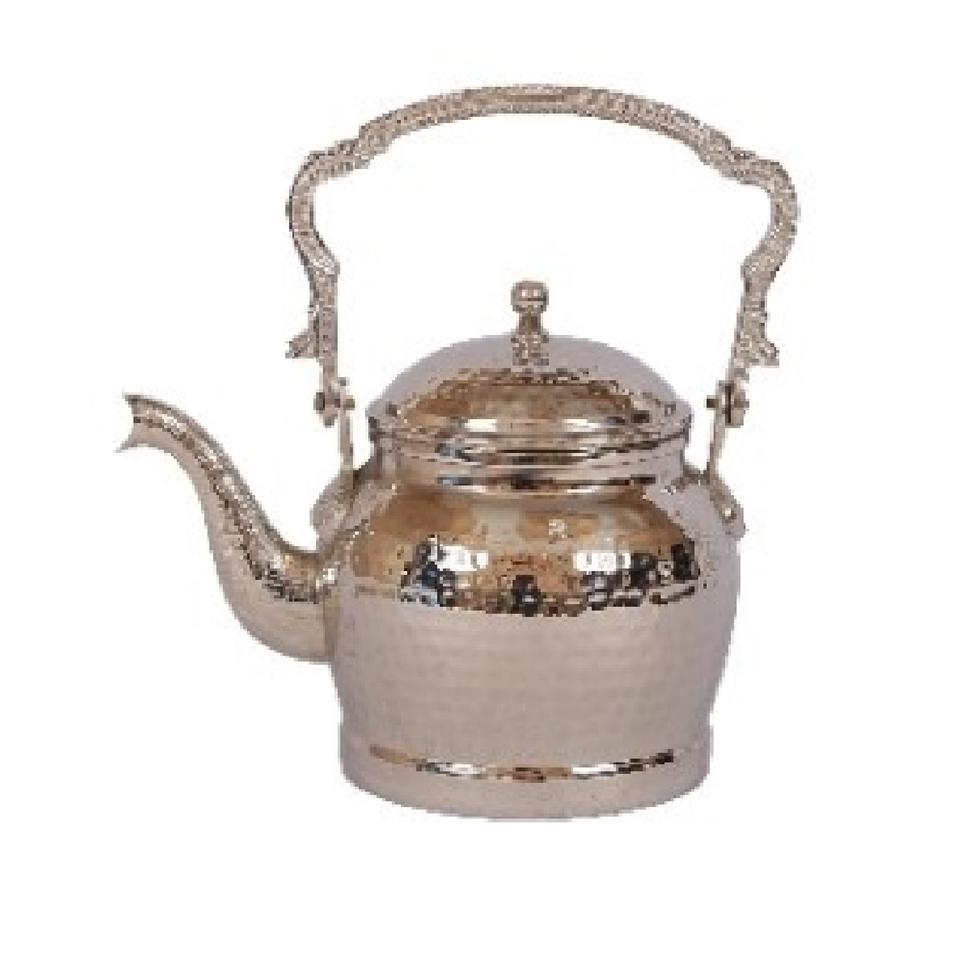 หม้อต้มชาทองเหลืองพร้อมฝาที่จับขนาดใหญ่และช้อนสำหรับเสิร์ฟชาหรือกาแฟสำหรับใช้ในบ้านหรือในโรงแรม