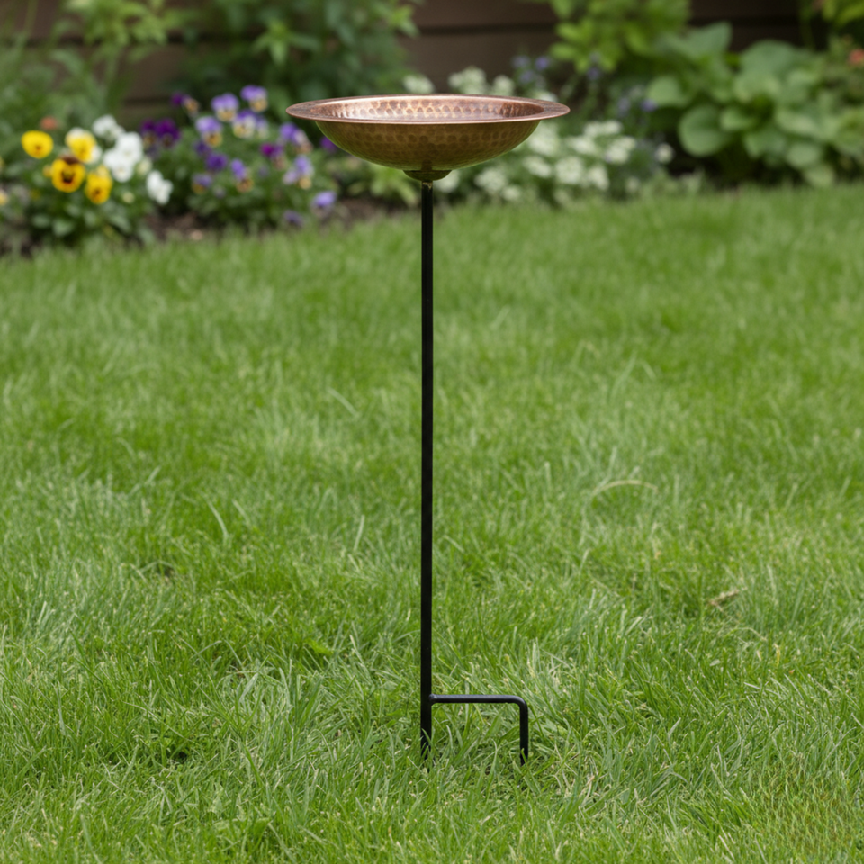 อ่างน้ำนกทองแดงตีขึ้นรูปด้วยมือ พร้อมเสาโลหะ สำหรับให้อาหารนกกลางแจ้ง ตกแต่งสวน สนามหญ้า และลานบ้าน