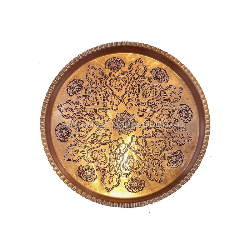 ถาดทองแดงทุบสำหรับตกแต่งโรงแรมและร้านอาหารถาดเสิร์ฟทองแดงด้ามทองเหลืองทรงกลมหรูหรา