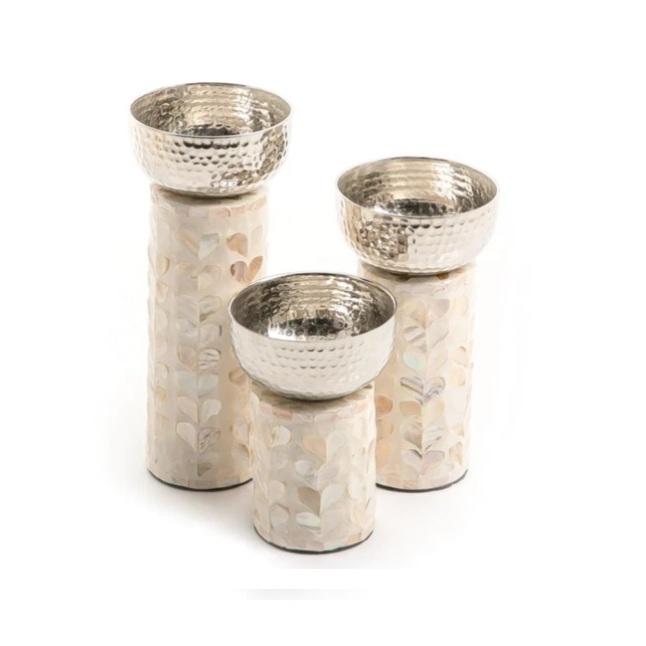 ชุดชามสแตนเลสคุณภาพสูง 3 ใบ ดีไซน์ลายตอก ชุบเงิน พร้อมฐานมุก สำหรับงานเลี้ยงสุดหรู