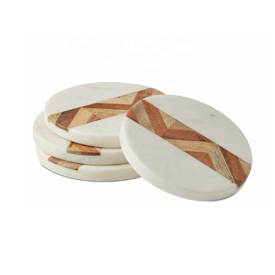 ชุดจานรองแก้วหินอ่อนและไม้ตอกชุดจานรองแก้ว 4 ชิ้นสําหรับเครื่องดื่มกาแฟชากลางโต๊ะอาหารจานรองแก้วที่ทันสมัยสําหรับตกแต่งบ้าน