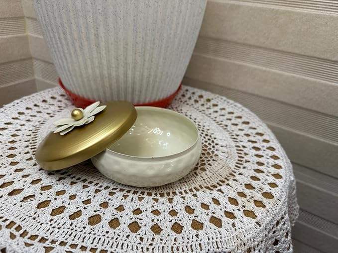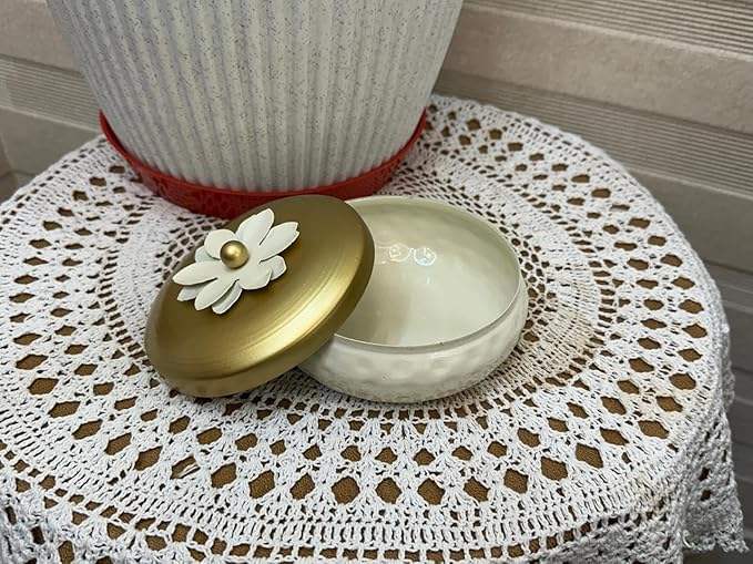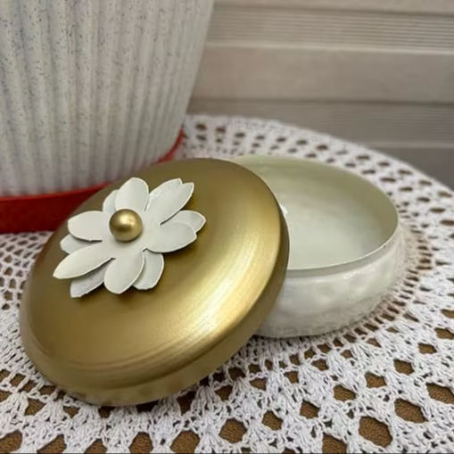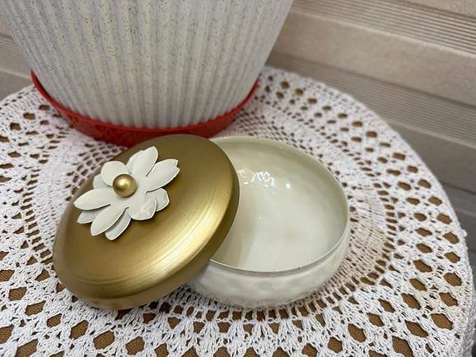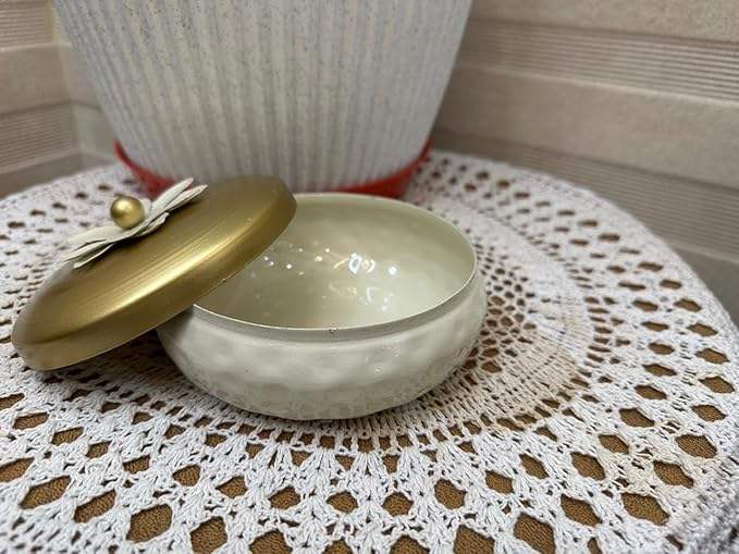 กระปุกใส่ขนมโลหะลายตอกสีขาวทอง ฝาปิดลายดอกไม้ กล่องใส่เครื่องประดับตกแต่ง กระป๋องเก็บของขนาดเล็ก ของชำร่วยงานแต่งงาน ของขวัญ ของตกแต่งโต๊ะ