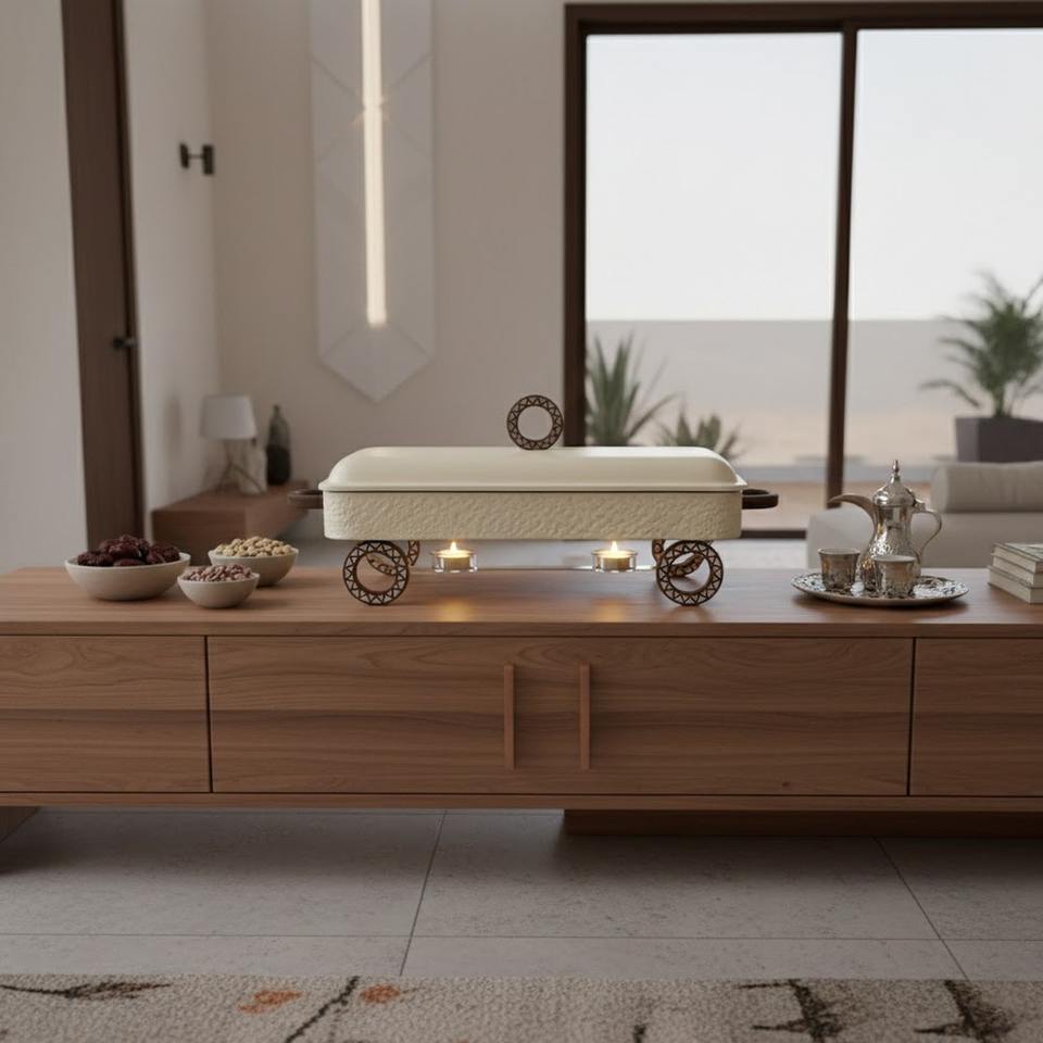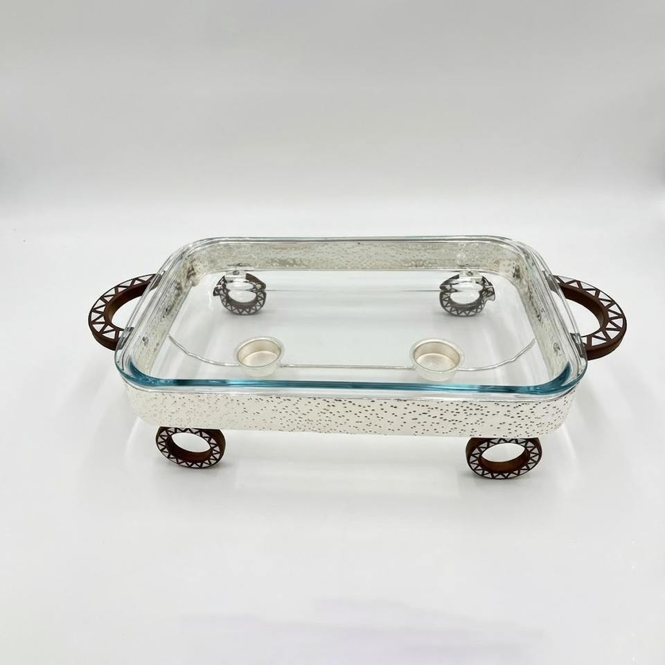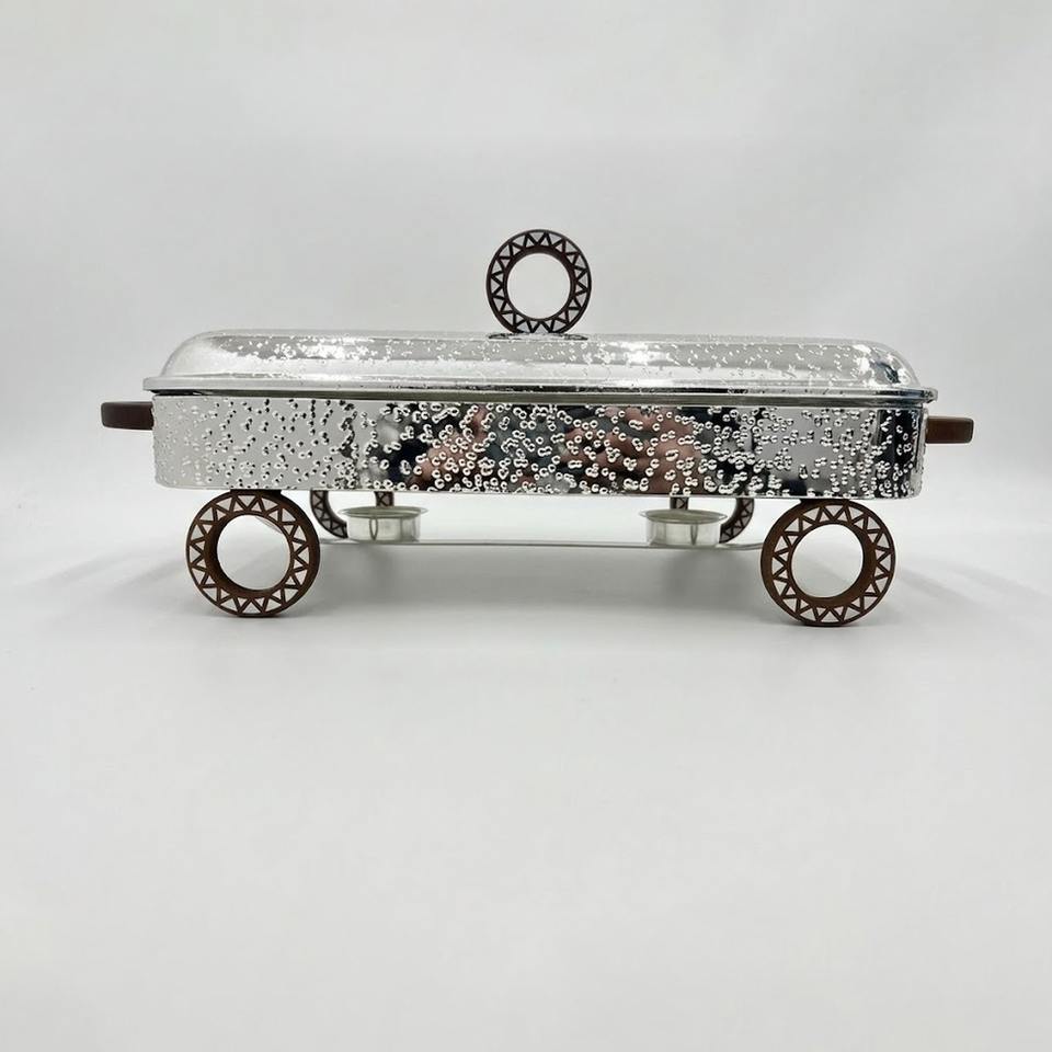 ถาดอุ่นอาหารทรงสี่เหลี่ยมแบบตอกลายสีเงิน พร้อมล้อไม้ตกแต่ง และเตาเผาเทียนสำหรับงานแต่งงานและจัดเลี้ยง