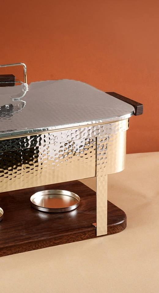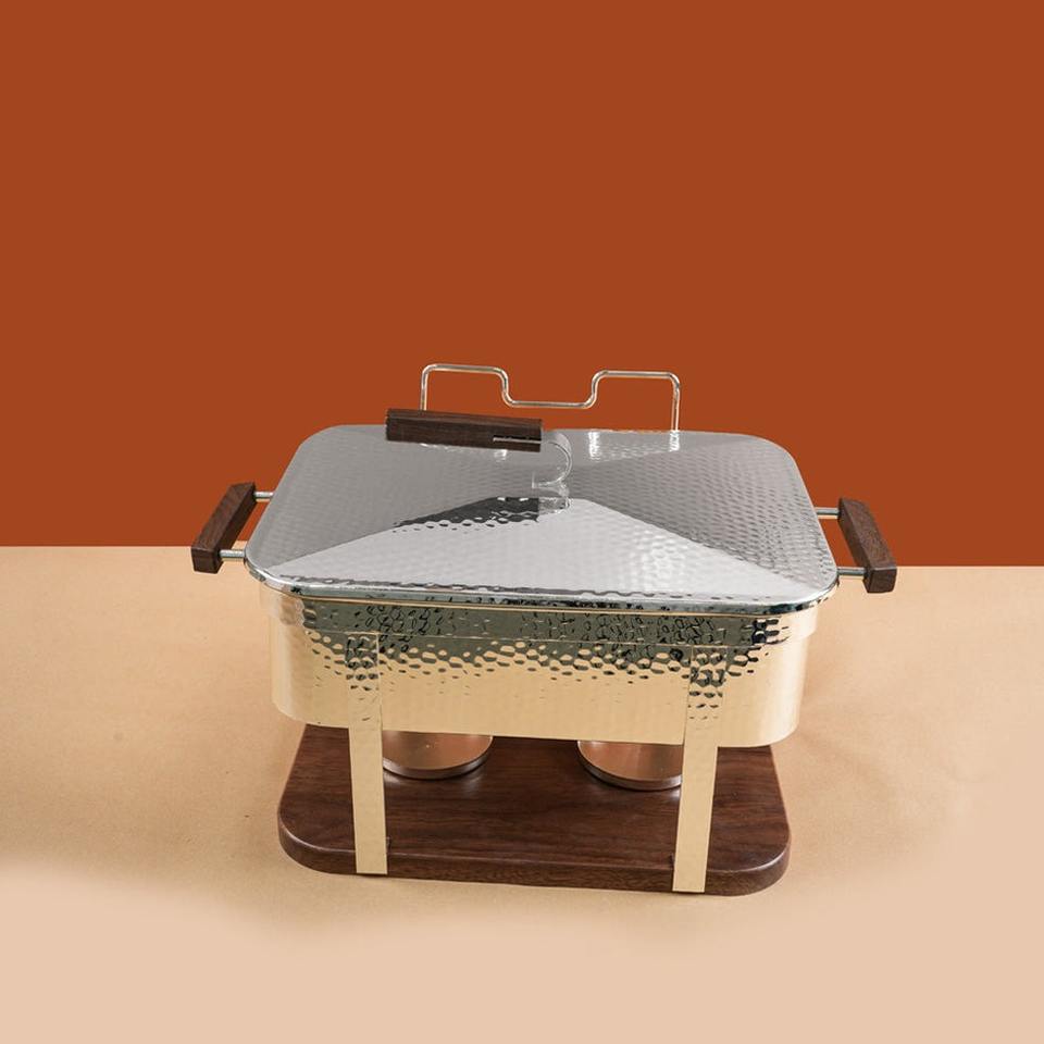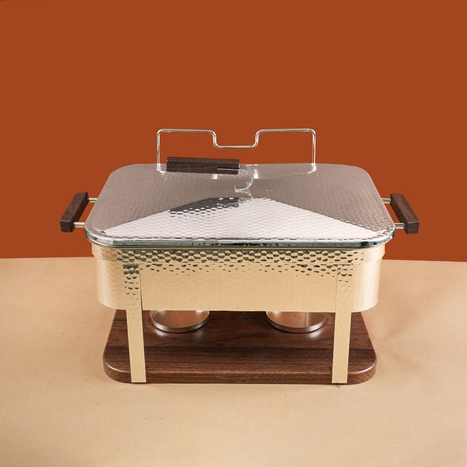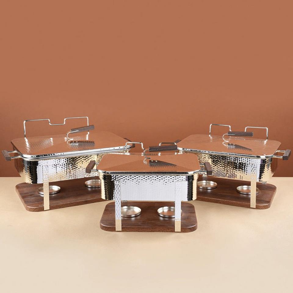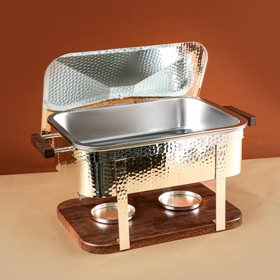 ถาดอุ่นอาหารสแตนเลสแบบตอกลายพร้อมฐานและหูจับไม้ รูปทรงสี่เหลี่ยมผืนผ้า สำหรับงานจัดเลี้ยงโรงแรมระดับมืออาชีพ