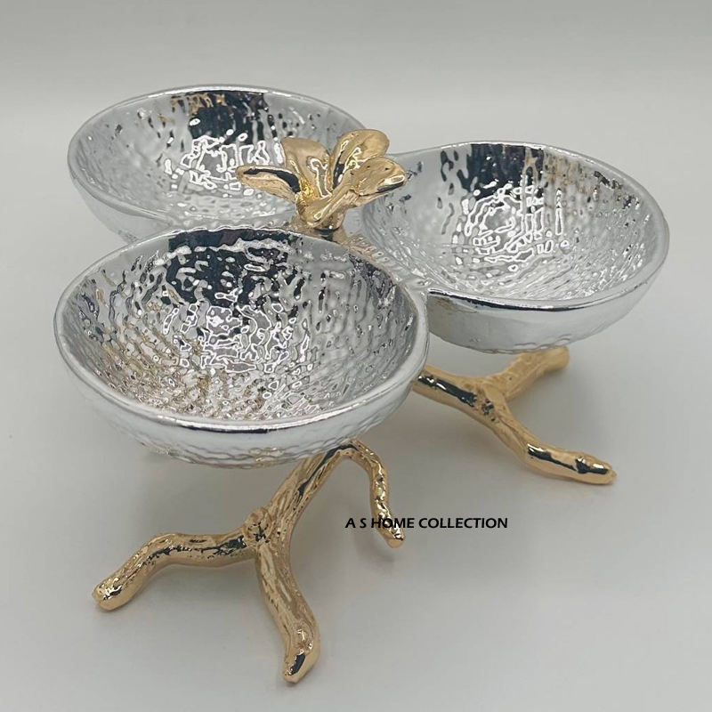 ชามโลหะทรงกลมสีเงินเนื้อค้อนพร้อมดีไซน์สีทองที่ยิ่งใหญ่ที่สุดผลไม้วันที่ให้บริการตกแต่ง