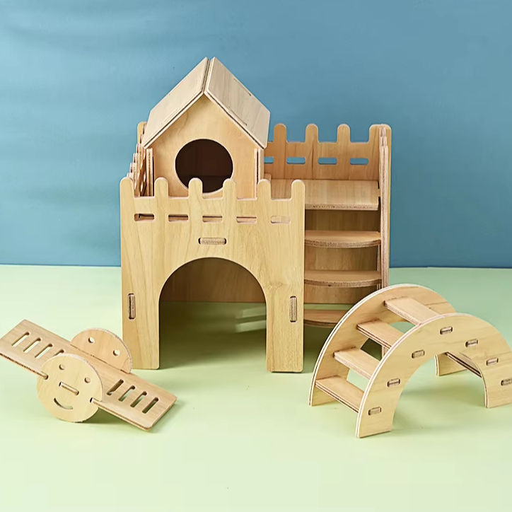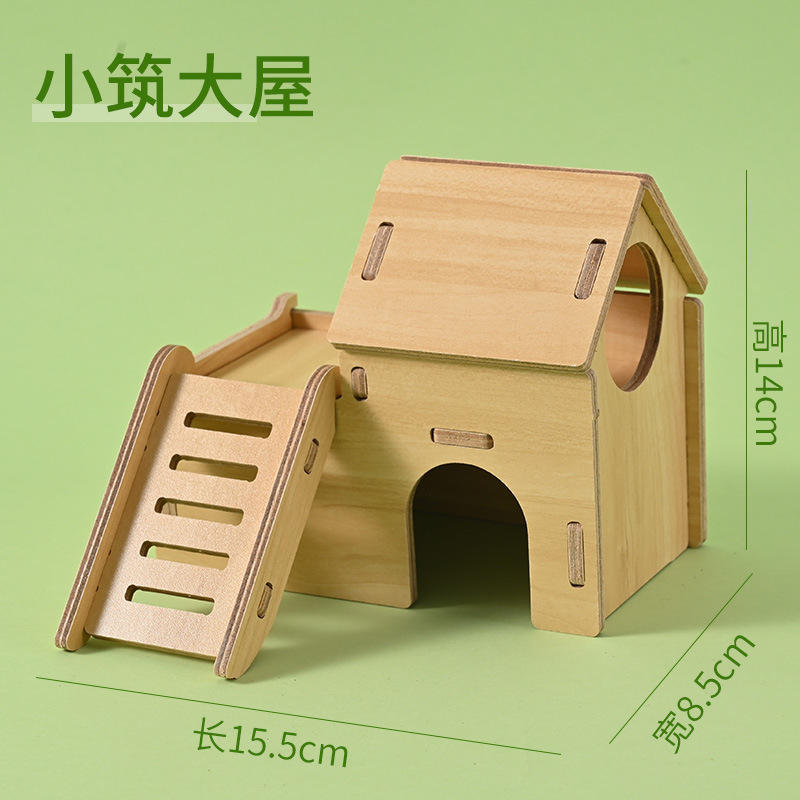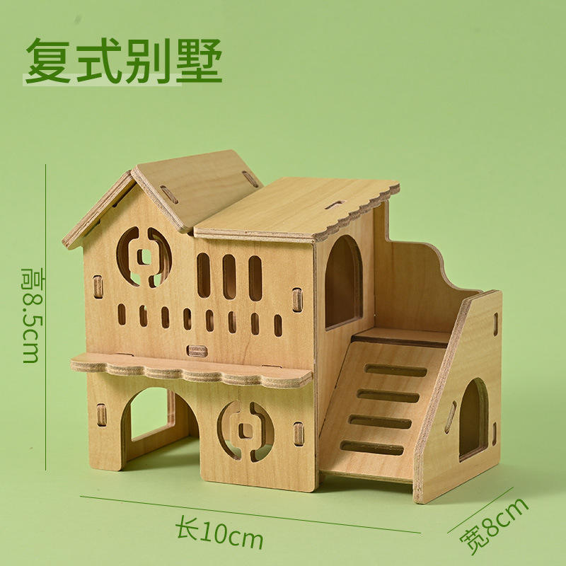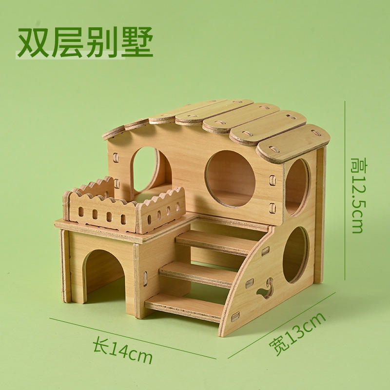บ้านแฮมสเตอร์ไม้เนื้อแข็ง ของเล่นบ้านหลังเล็ก บ้านหลบภัยสำหรับแฮมสเตอร์สีทอง บ้านสองชั้น วิลล่าไม้พร้อมชิงช้า ของเล่นแฮมสเตอร์ตกแต่งภูมิทัศน์