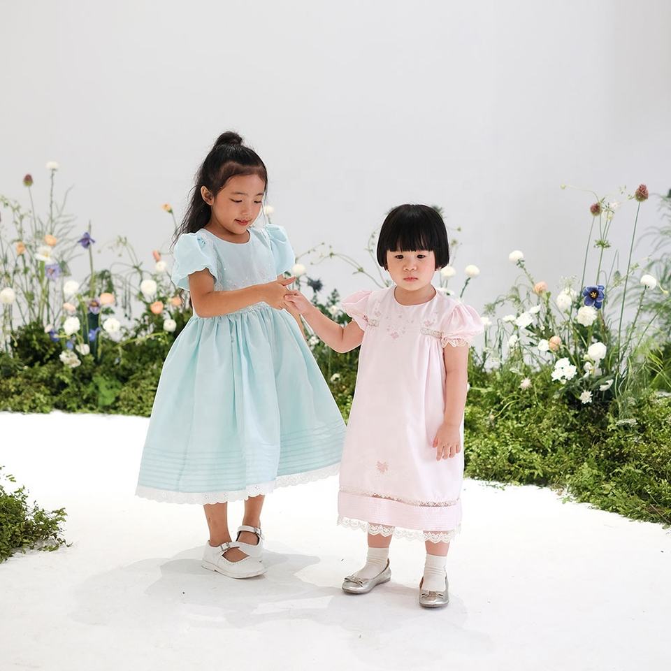 ชุดเดรสผ้าคอตตอนสำหรับเด็กผู้หญิงชุดเดรสแขนสั้นสีฟ้าชุดเดรสเบีทริกซ์ปักสำหรับโอกาสพิเศษงานตามสั่ง